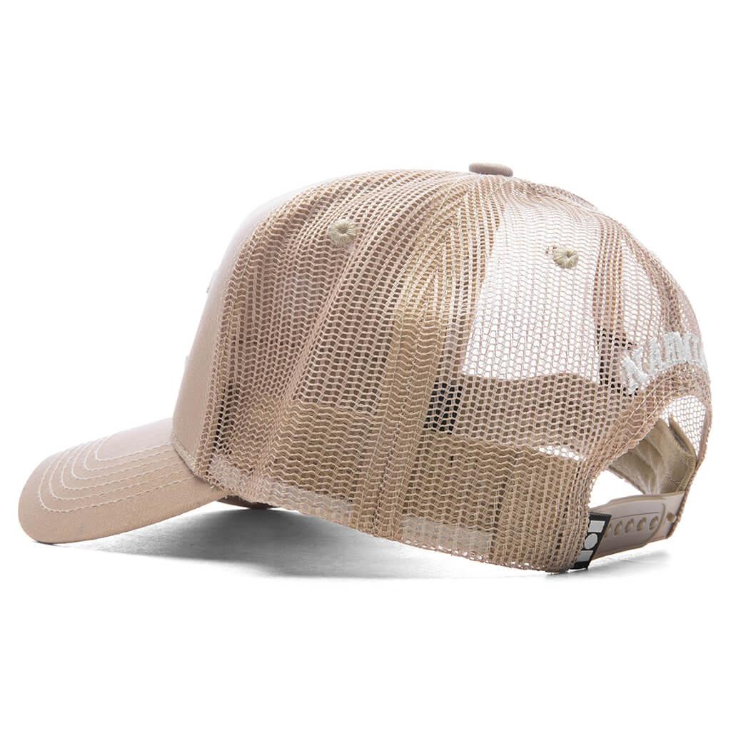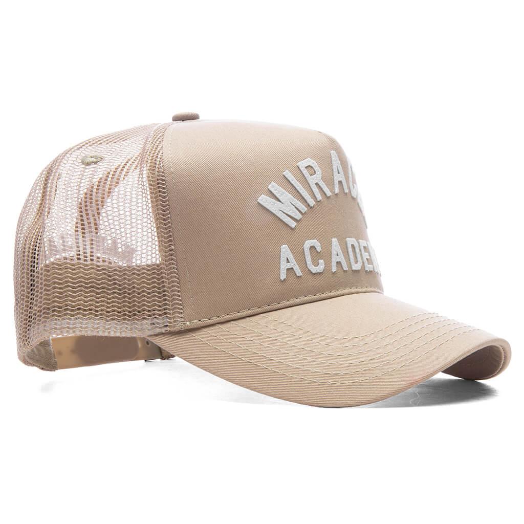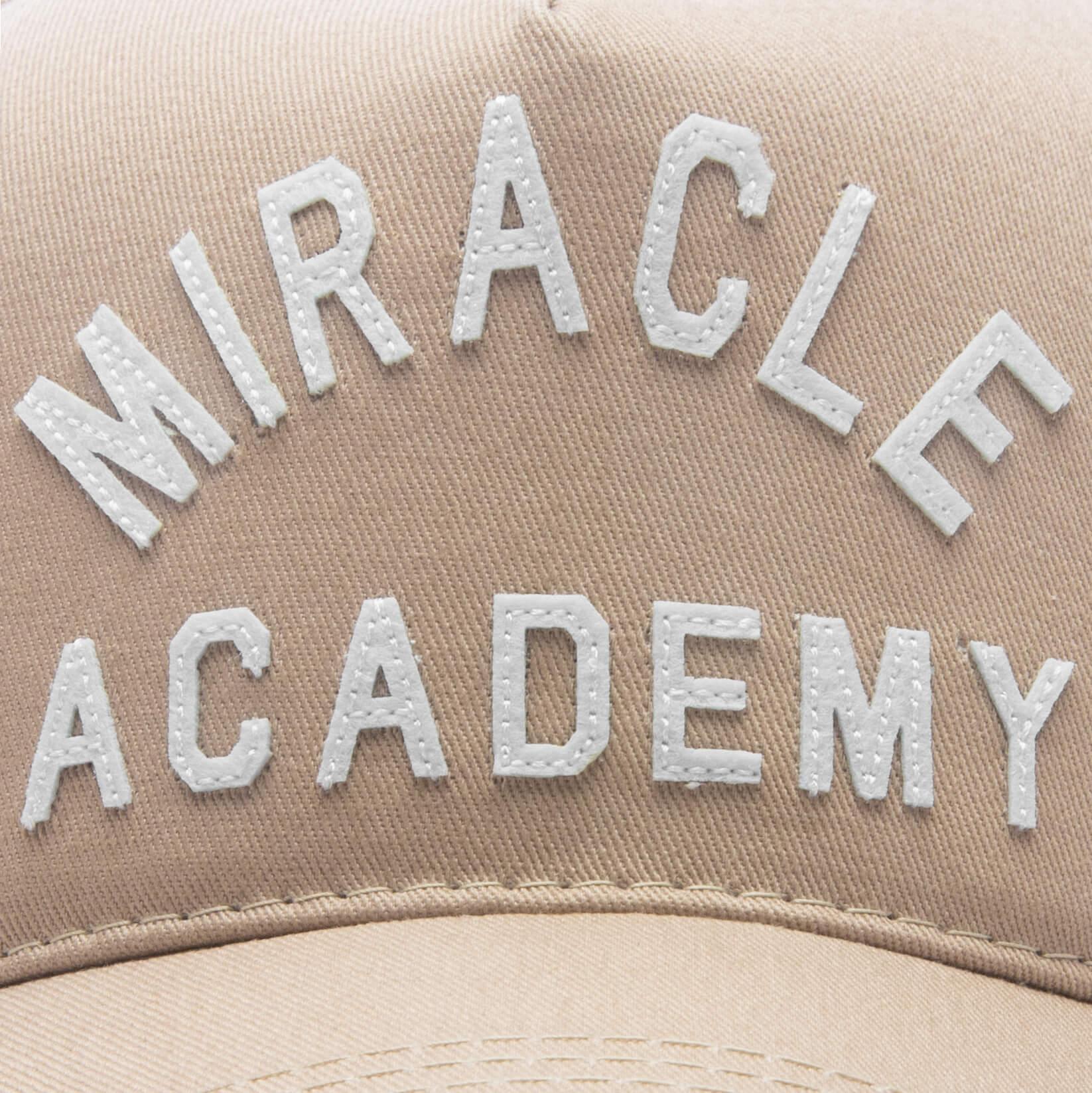 Luxury Los Angeles label Nahmias introduces the Miracle Academy Trucker Hat. This silhouette features a five-panel construction composed of cotton at the front and a Miracle Academy embroidered patch. Finishing touches include a curved brim, snapback closure, and more embroidered detailing at the back. Cotton and Nylon Curved brim Embroidered patch Embroidered branding Adjustable snapback closure Five-panel design Style No: TR2-G32-270