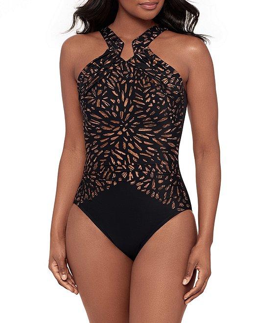 From Miraclesuit, this one piece swimsuit features: High neck silhouette Engineered print Halter neckline Soft cups Adjustable straps Cleverly draped fabric conceals tummy Open back Moderate coverage No lining Pull-on construction Nylon/spandex Hand wash Imported.