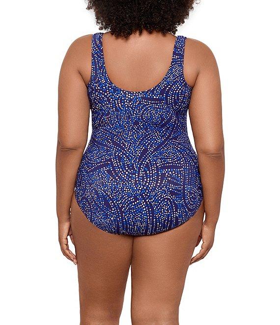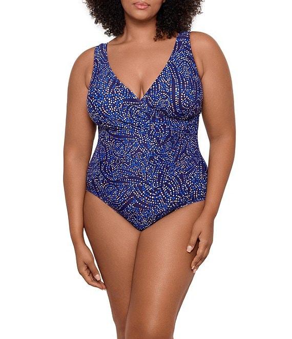 From Miraclesuit Plus, this one piece swimsuit features: Miratex fabrication Tank silhouette V-neckline Soft cups Fixed straps Scoop back Cleverly draped fabric conceals tummy Look 10 lbs. lighter Moderate cut leg Moderate coverage Fully lined Pull-on construction Nylon/spandex Hand wash Imported. Look 10 lbs. lighter in 10 seconds with Miraclesuit Miratex fabric provides allover body control, shapes and slims Soft cup Cleverly draped fabric conceals tummy.