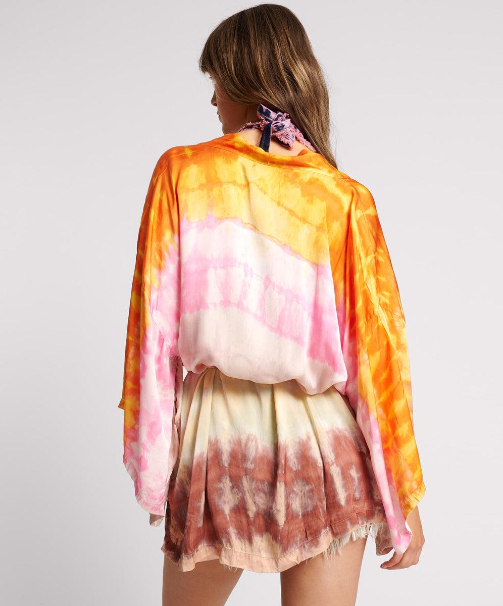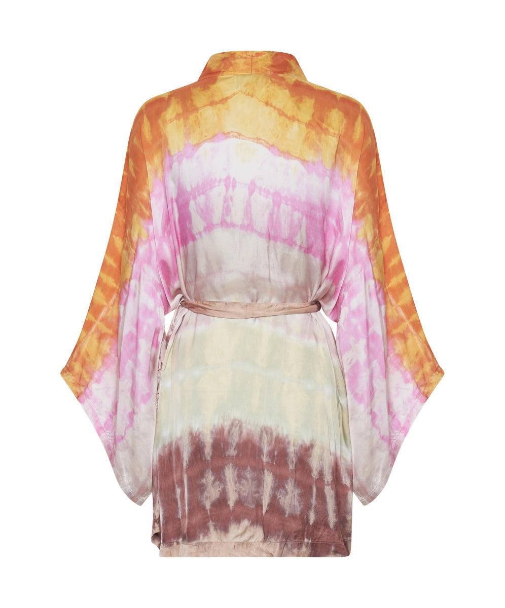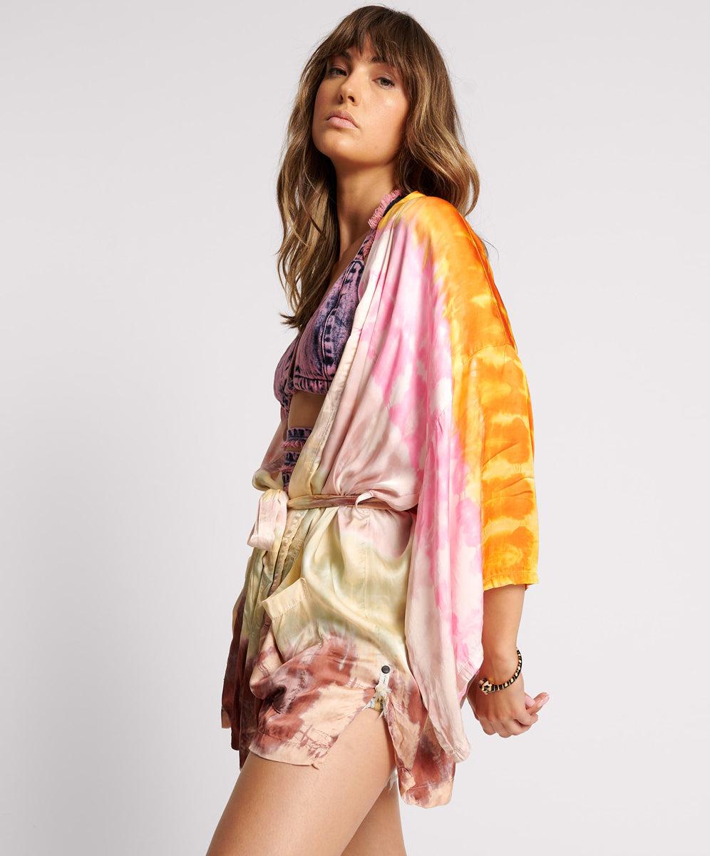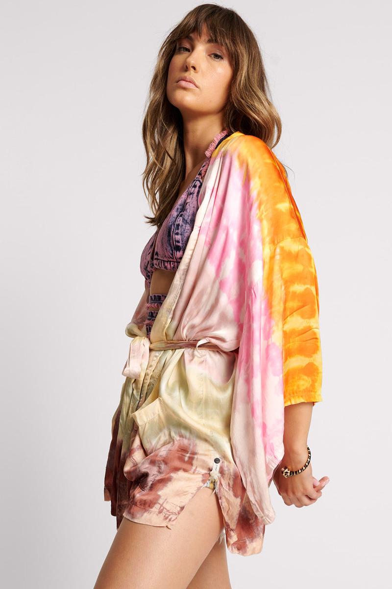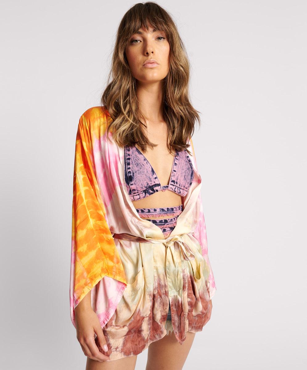 This is not an optical illusion. The MIRAGE HAND DYED SATIN KIMONO features front pockets and a waist tie. Loose fitting, slinky and sexy perfection. Model wears a size Small (size 4 USA or size 8 UK/AUSTRALIA)