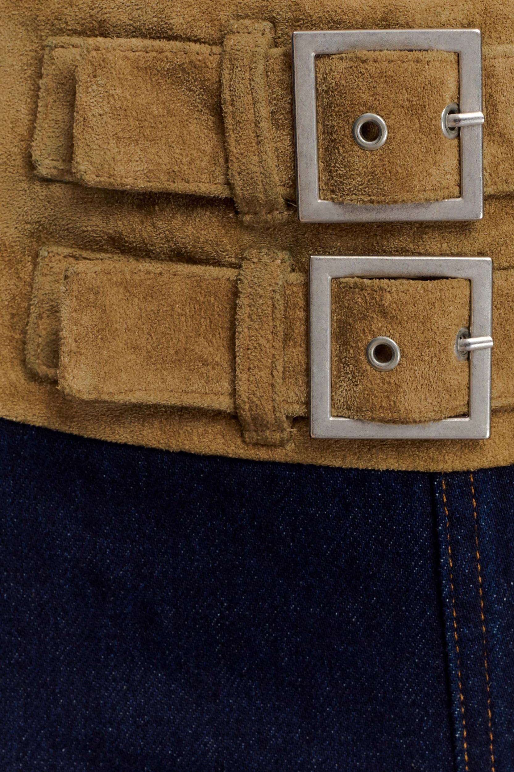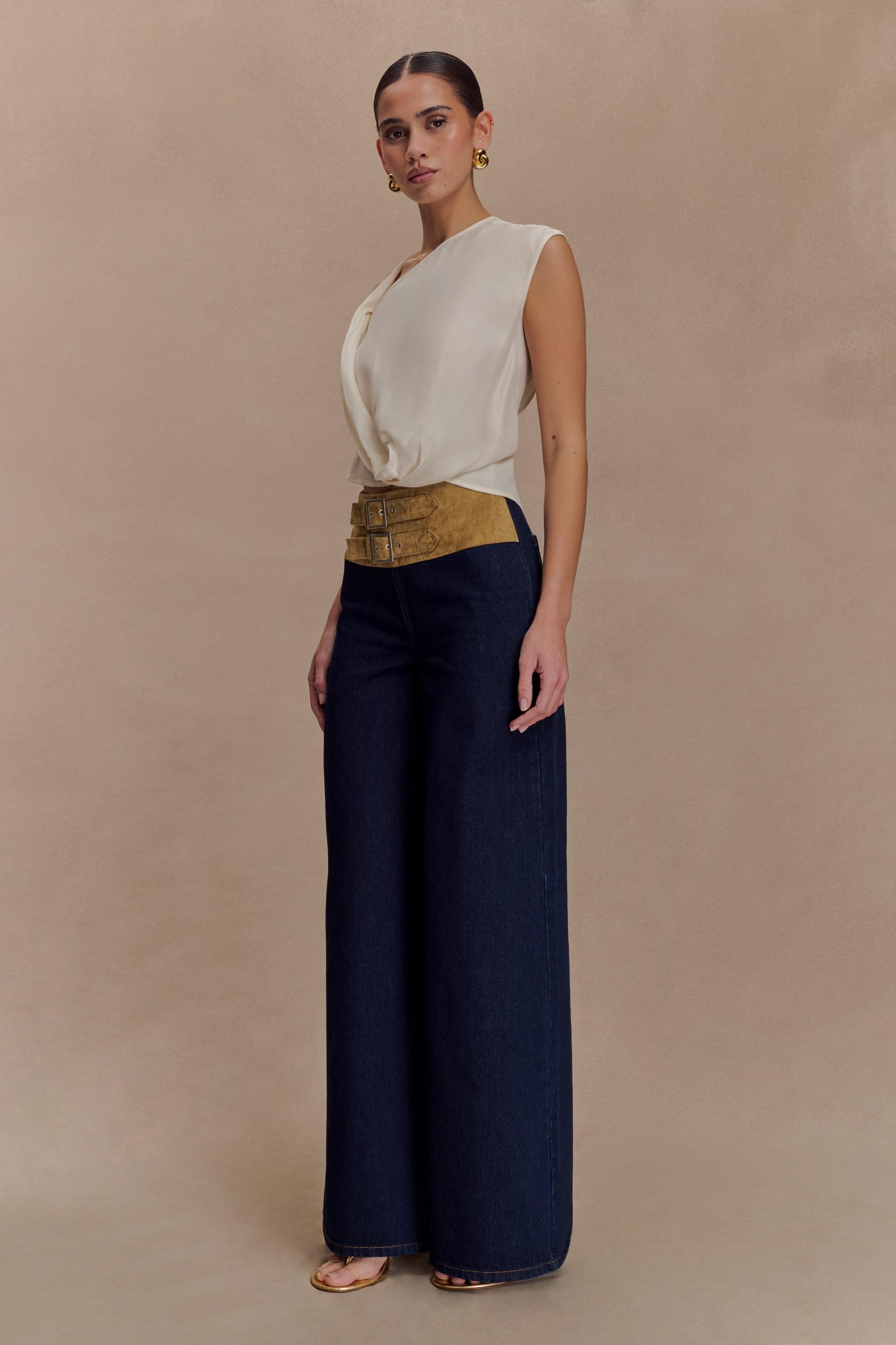 Buckle up in bold denim. The MIRANDA Suede Belted Denim Wide Leg Pants bring a bold fusion of texture and tailoring. Featuring a soft suede waist panel with a double buckle front, these mid-rise pants define the waist while offering a relaxed wide-leg silhouette. Finished with a side zip for a clean line, they’re the perfect mix of polished and effortless—ideal for styling from brunch to bold evenings.