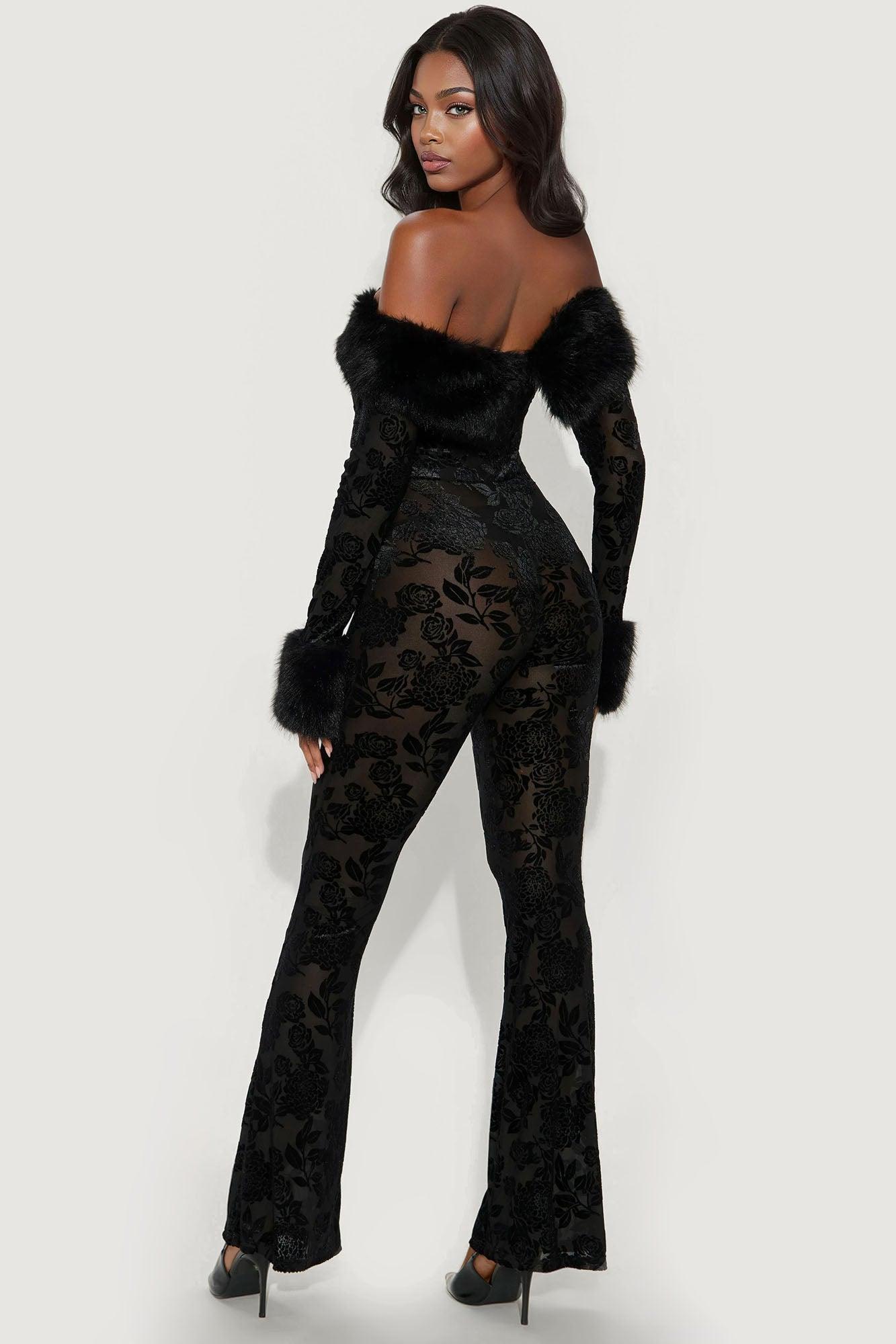 Available In Black. Jumpsuit Off Shoulder Stretch Padded Bra Invisible Back Zipper Flare Leg 36" Inseam Panty Included Final Sale Disclaimer: Burnout Placement Will Vary. Self: 70% Polyester 20% Nylon 10% Spandex Contrast/Lining/Panties: 100% Polyester Imported California Proposition 65WARNING: Cancer and Reproductive Harm - www.P65Warnings.ca.gov.