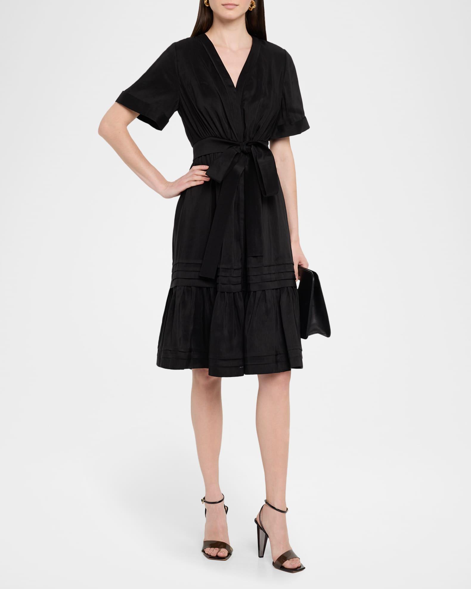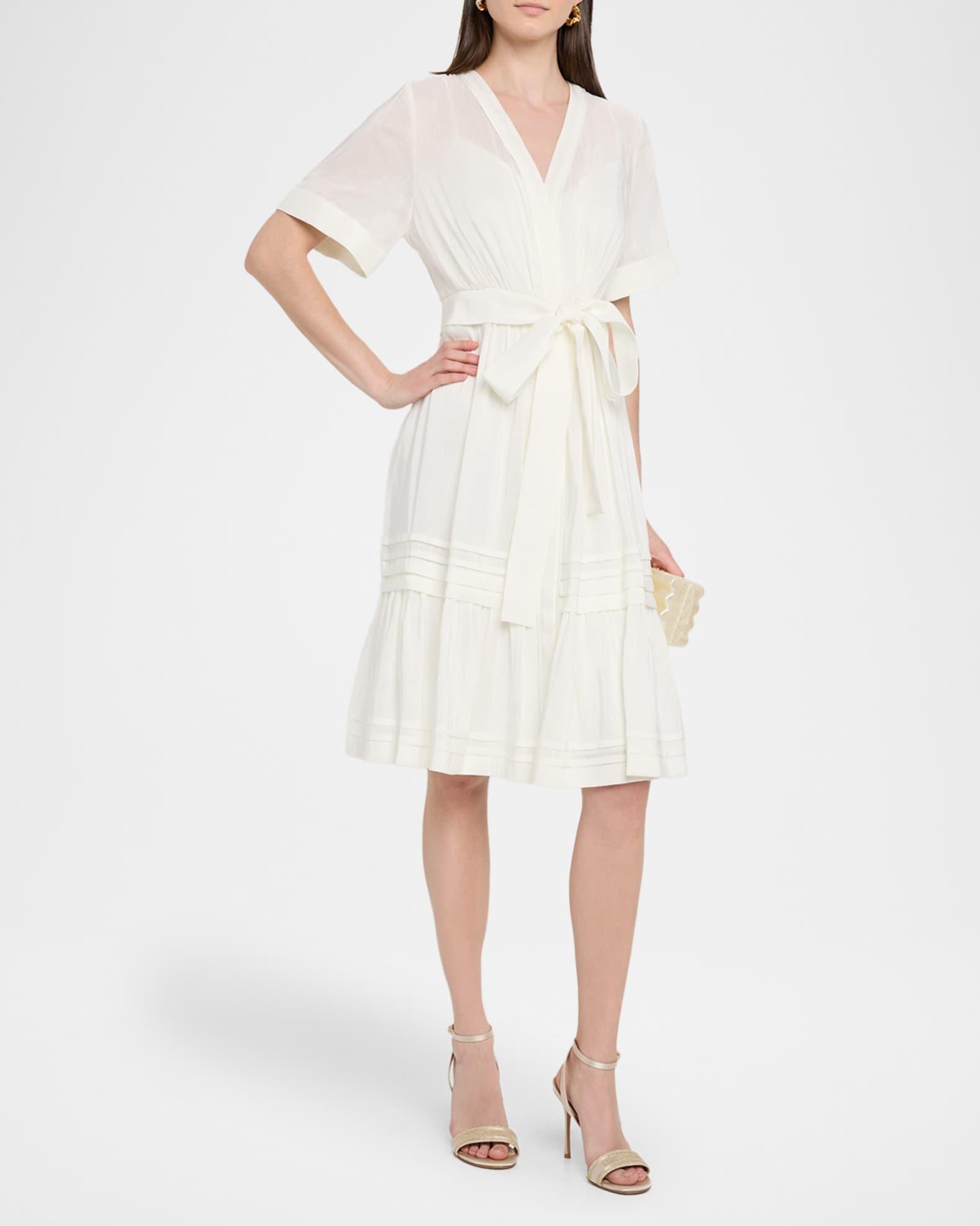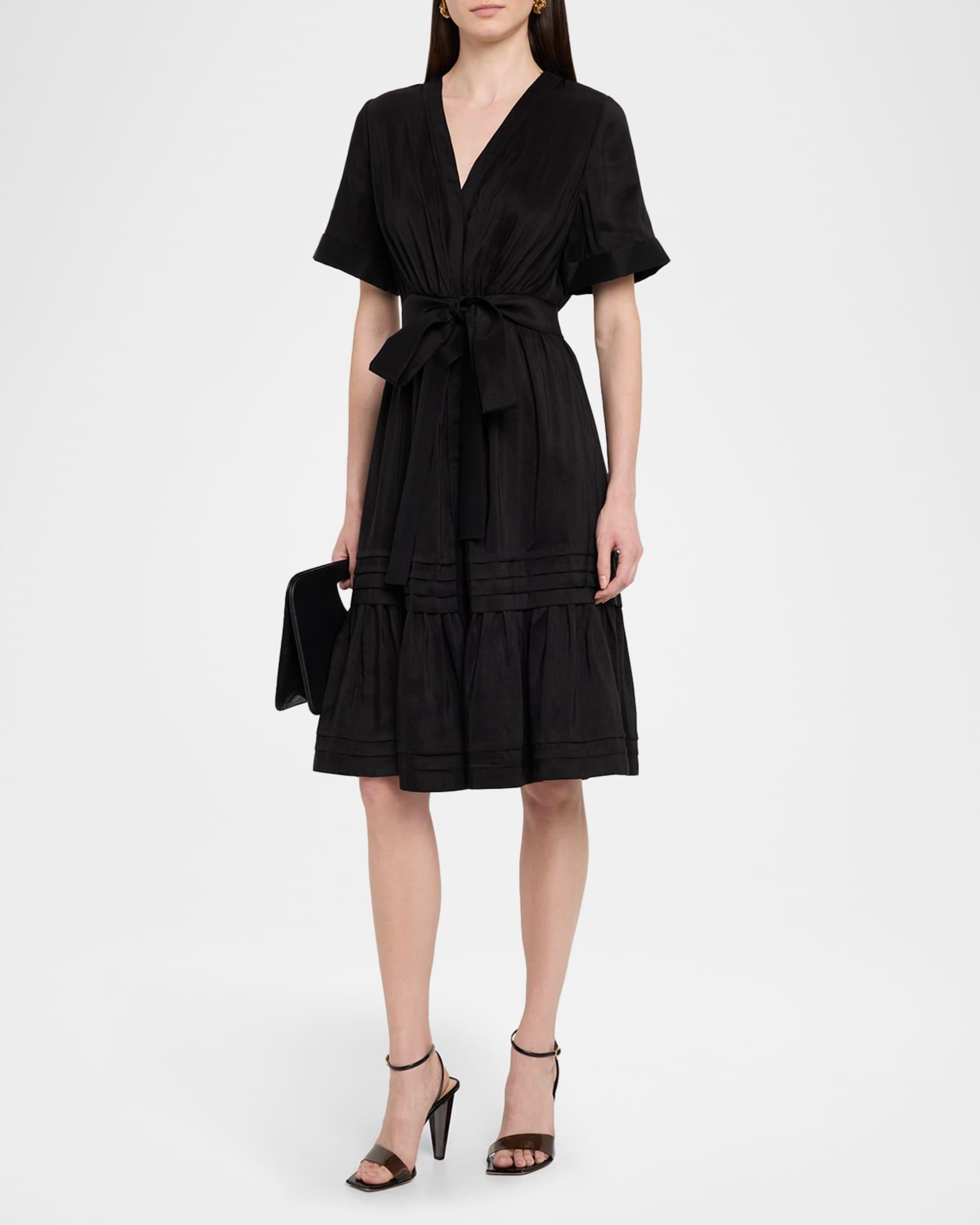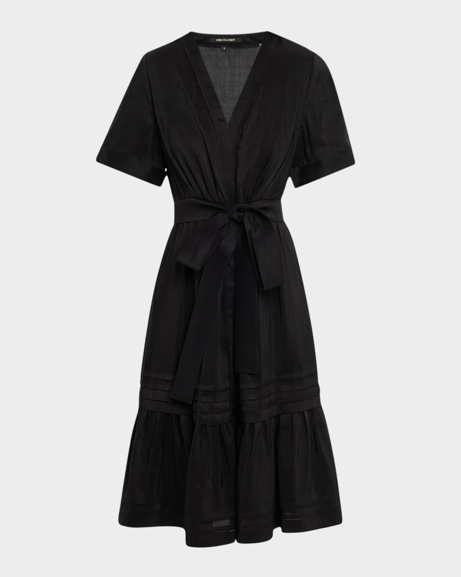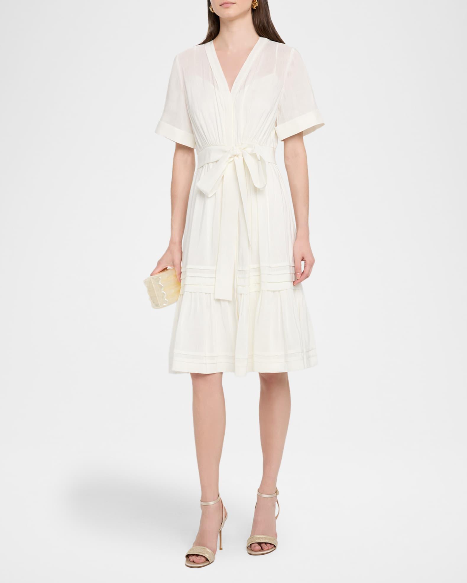 Made of a linen and silk blend, the Kobi Halperin "Miranda" midi dress is finished with ruching and tiered with pintuck ruffles Approx. 42.5"L from shoulders to hem V neckline Short sleeves Waist self-tie Hem hits around the knee A-line silhouette Linen/silk Lining: Polyester Dry clean Imported Shipping Direct from Vendor, usually ships within 7 business days.