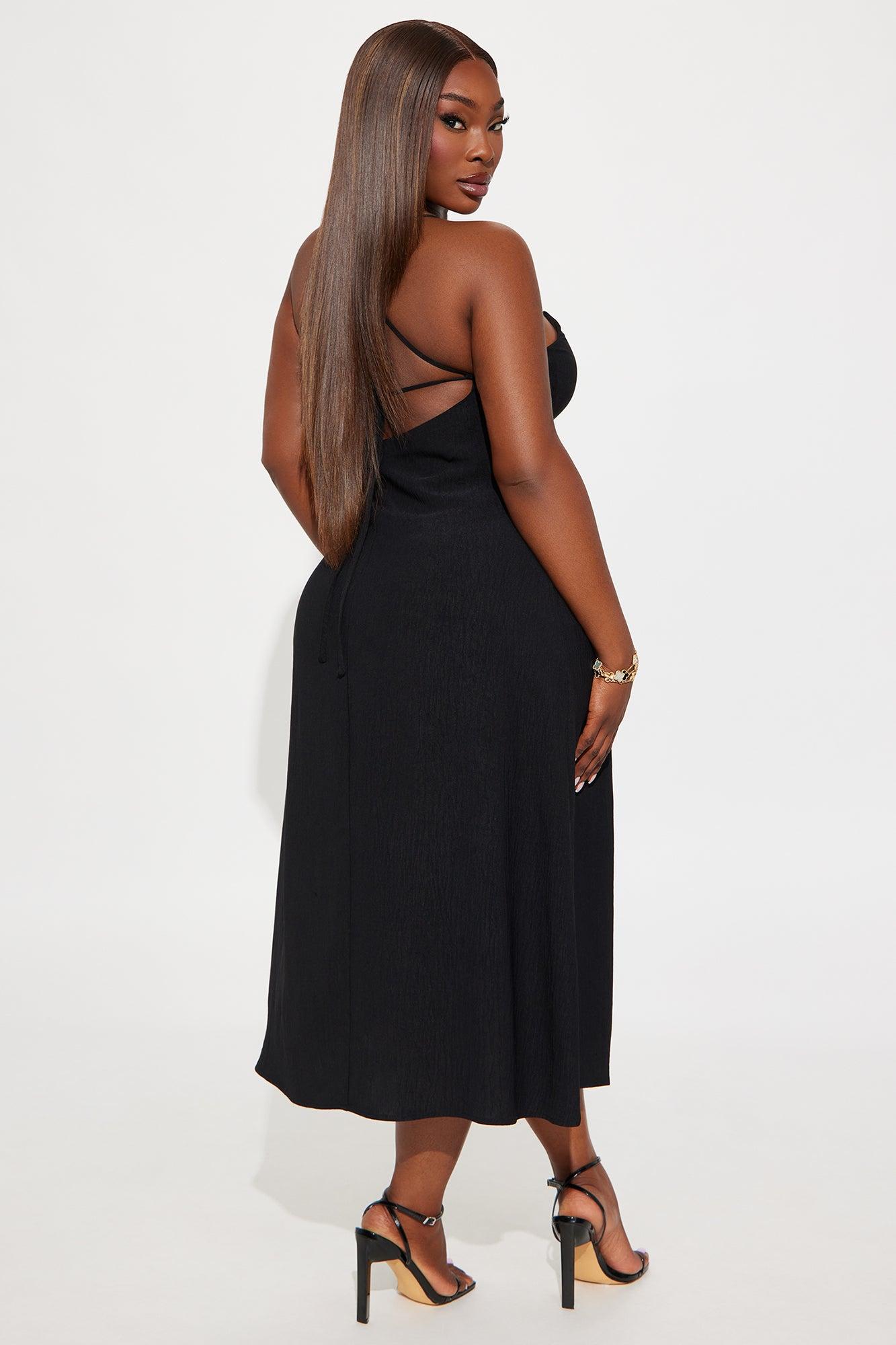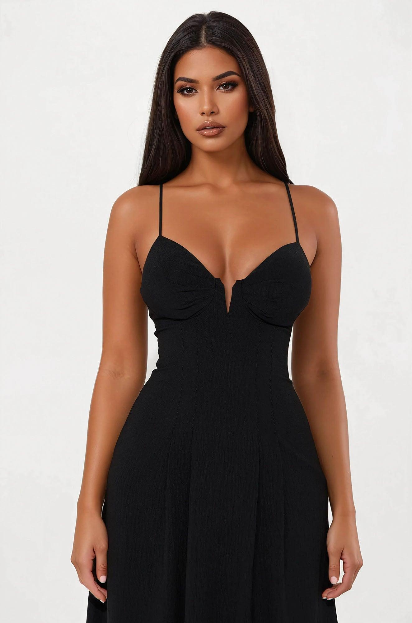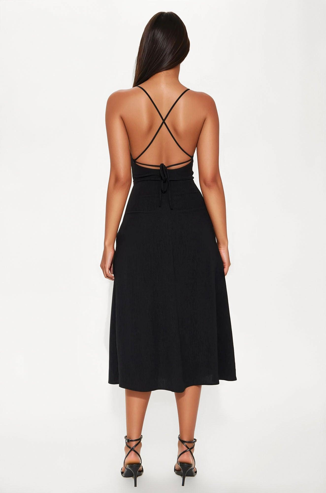 Available In Black, Royal, And Hot Pink. V Neck Midi Dress V-neck Spaghetti straps V-wire Padded bra cups Strappy back Side zipper Half lined Stretch Length measured flat = 45" Self: 100% Polyester Lining: 100% Polyester Imported