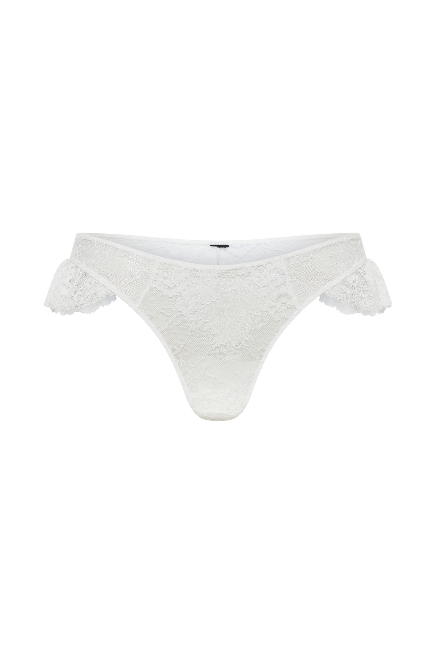 Wedding essential.Elevate your lingerie game with the MIREILLE Lace Frill Briefs, where comfort meets allure in a stunning blend. Boasting an elastic waistband for a snug fit, these briefs are crafted from delicate lace fabrication, adding an elegant and sensual touch to your collection. But it's the frill detailing on the hip that truly steals the show, injecting a playful and flirtatious vibe into your look. Offering cheeky coverage, they strike the perfect balance between sultry and sophisticated, ensuring you feel empowered and glamorous every time you wear them. Pair with the Anniston Lace Frill Triangle Bralette or Blaise Lace Frill Underwire Bra to complete the look.
