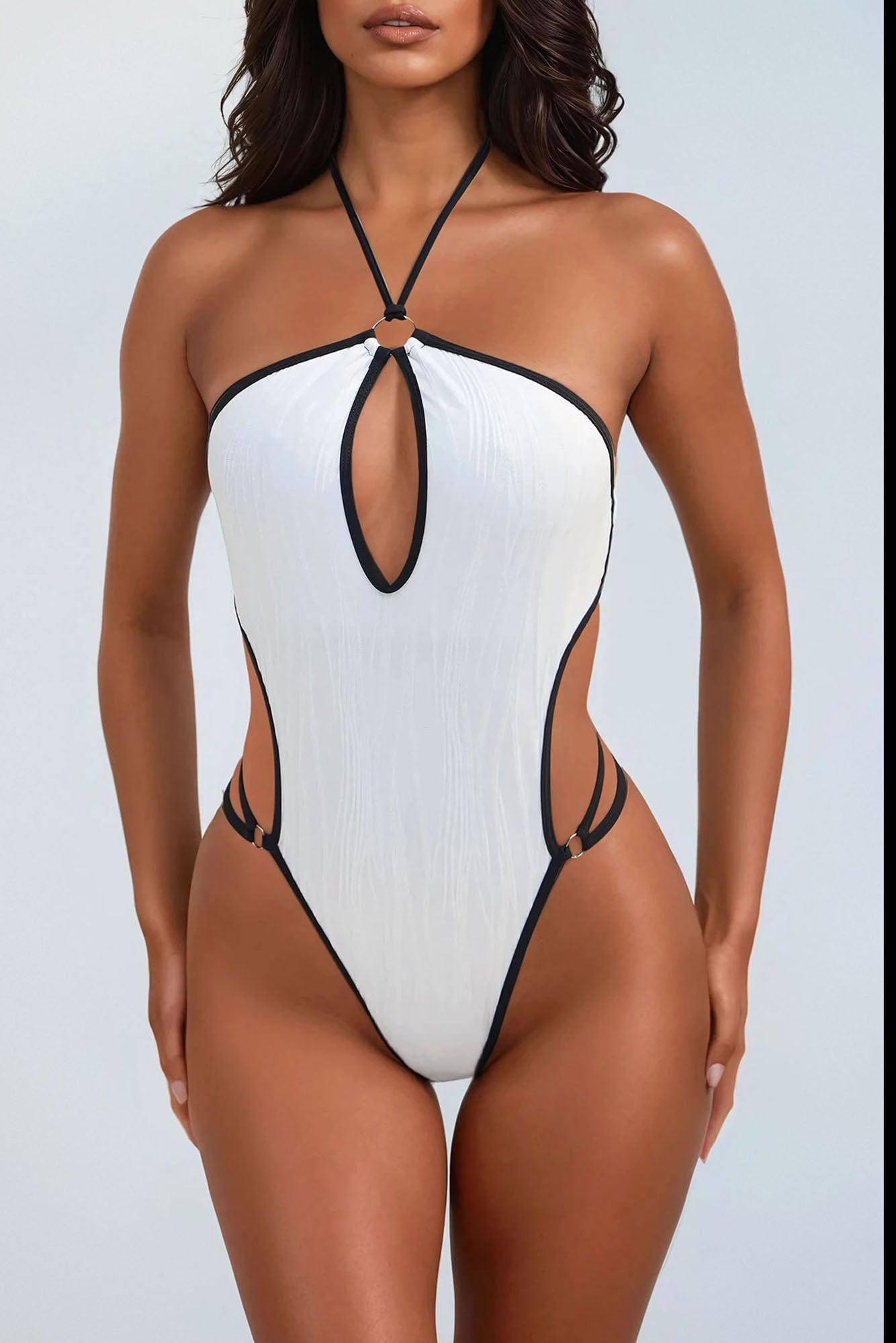 Available In White/Black. 1 Piece Swimsuit Textured Halter Neck Ties Removable Cups Cut Out O-Ring Contrast Trim Brazilian Bikini Bottom, Cheeky Open Back Full Stretch Final Sale Shell: 90% Polyester 10% Spandex Lining: 95% Polyester 5% Spandex Imported