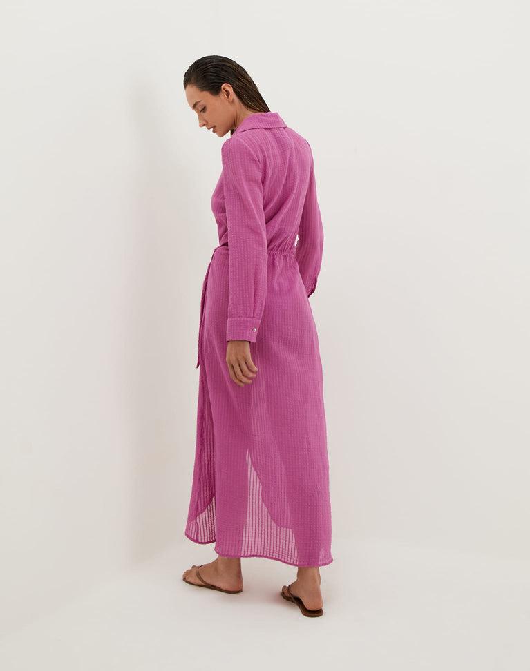 The ViX Mirian Long Cover Up is a wrap-style dress featuring a spread collar, long sleeves with buttoned cuffs, V-neckline and a side tie knot closure at the hip. Style the Mirian Long Cover with a matching swimsuit or bikini, sandals and ViX accessories for a vacation-ready look. Features: Long wrap-style cover up dre