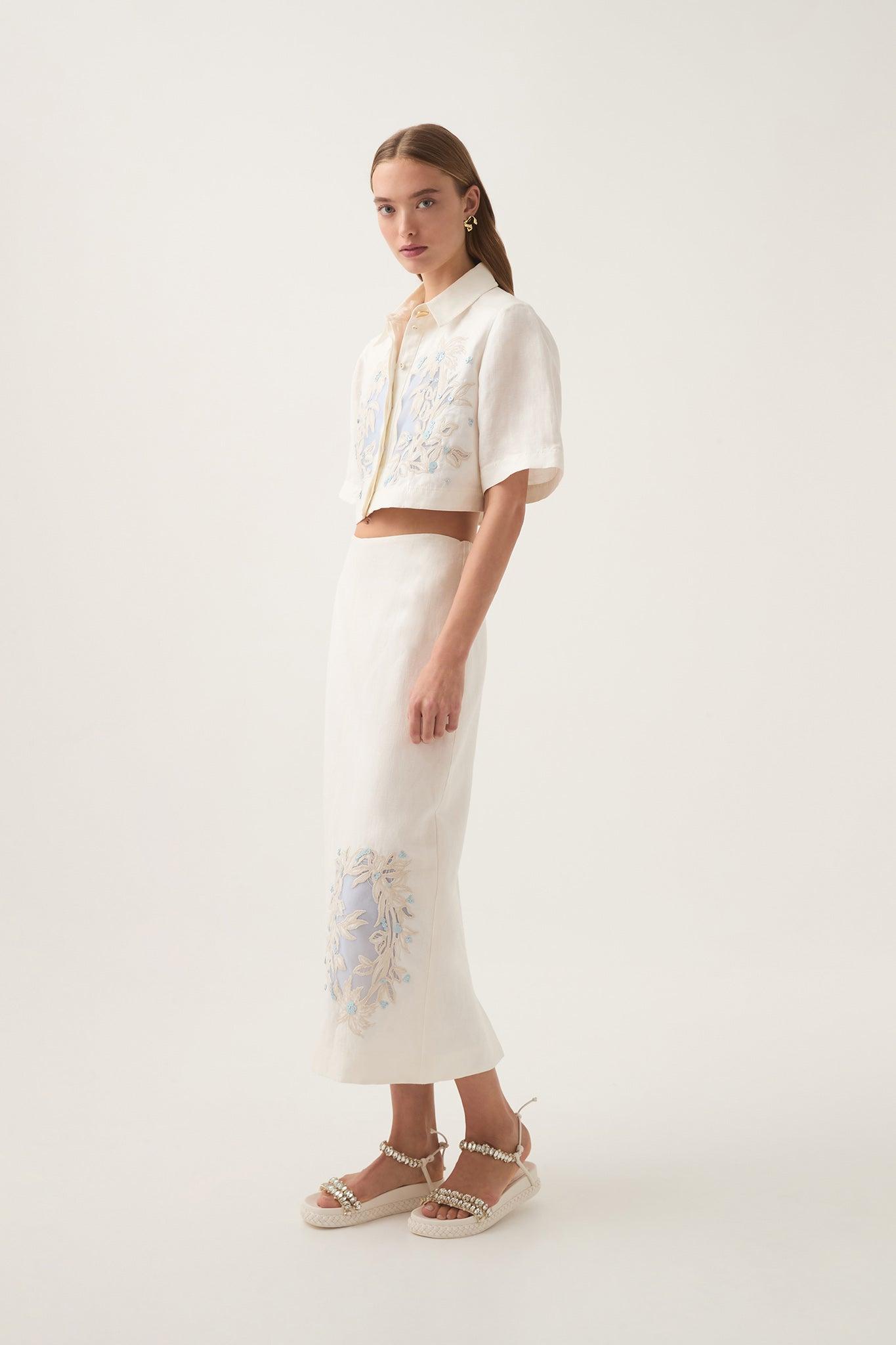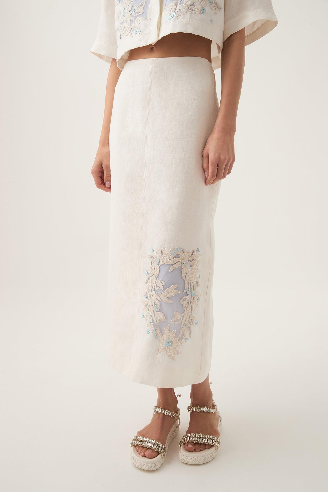 PRODUCT DETAILS Women's midi skirt Embroidered and embellished detail at side front Zip, hook and eye closure Back hem split Lined 65% Linen 35% Viscose Dry Clean Only P Shop All Skirts SIZE AND FIT Model wears a size AU 8/S Height: 175cm/ 5’9 Bust: 80cm Waist: 60cm Hips: 90cm