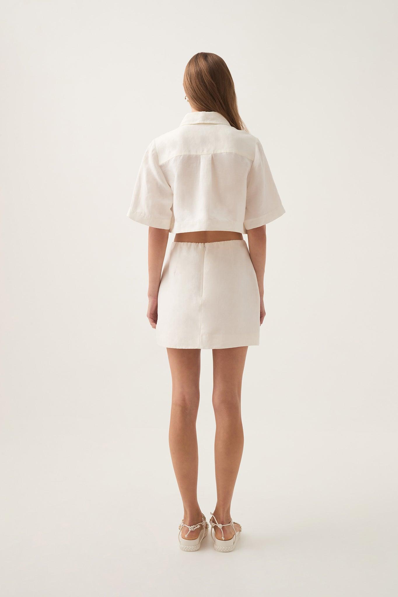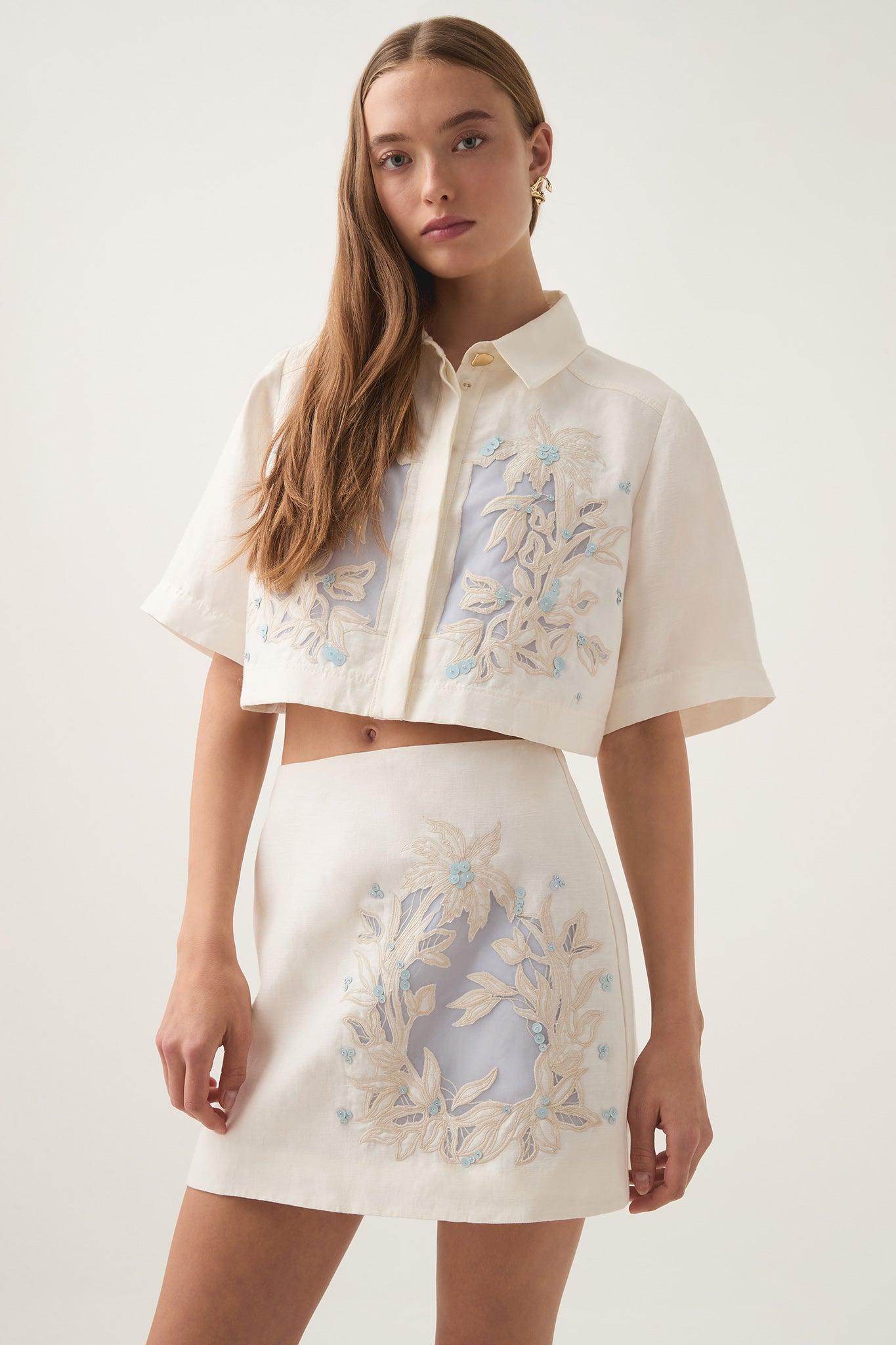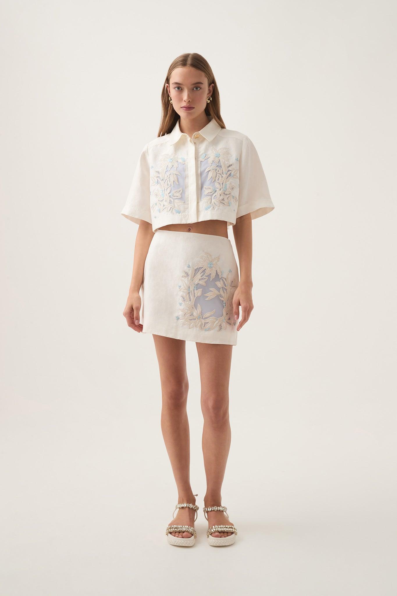 PRODUCT DETAILS Women's mini skirt Embroidered and embellished detail at side front Zip, hook and eye closure Lined 69% Linen, 31% Viscose Gentle and Low Heat Dry Clean Only Shop All Skirts SIZE AND FIT Model wears a size AU 8/S Height: 175cm/ 5’9 Bust: 81cm Waist: 60cm Hips: 89cm