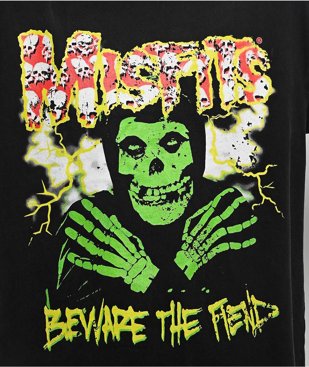 Gaining notoriety in the early 80's as pioneers of the horror punk music genre, the Misfits deliver the Beware Fiend t-shirt in solid black. Lending a vintage look with a screened graphic on the front, the short sleeve pictures the morbid band mascot