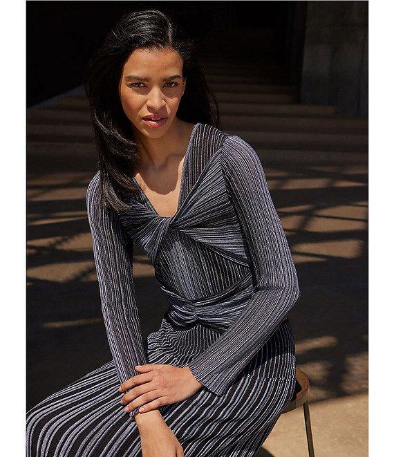 From MISOOK, this dress features: Lurex shimmer knit fabrication Fit and flare silhouette V-neckline Long sleeves Twist front detail Straight hem Pullover construction Approx. 51" length Acrylic/polyester/nylon/metallic Lining: polyester/spandex Hand wash Imported.