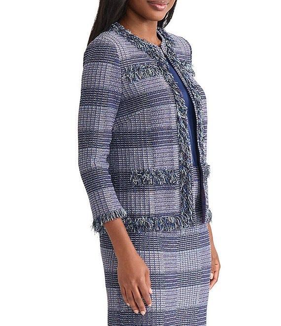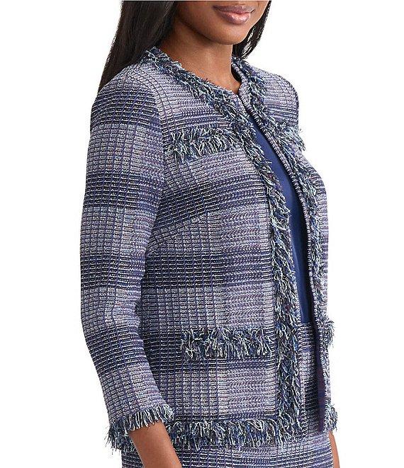 From MISOOK, this jacket features: Plaid knit fabrication Crew neckline Bracelet sleeves Faux front pockets Fringe trim Straight hem Hook front closure Approx. 23" length Acrylic/nylon/rayon Hand wash Imported.