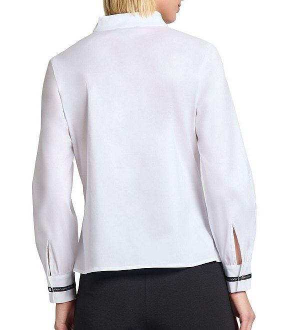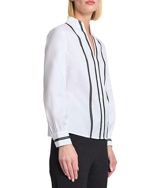 From MISOOK, this blouse features: Stretch woven fabrication Stand collar v-neckline Long sleeves with button cuffs Ribbon trim Straight hem UnlinedPullover construction Approx. 24" length Cotton/nylon/spandexHand wash Imported.