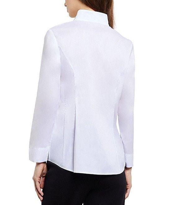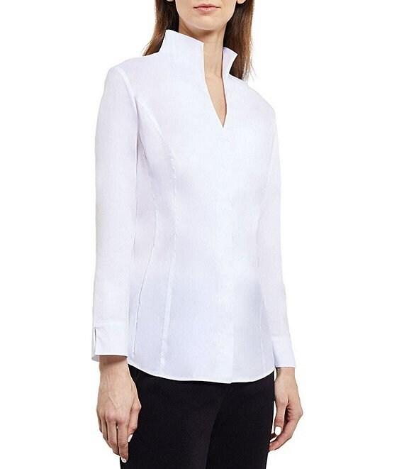 From MISOOK, this blouse features: Stretch woven fabrication Stand collar v-neckline Long sleeves with split cuffs Princess seaming Round hem Hidden button front closure Approx. 26" length Cotton/nylon/spandex Hand wash Imported.