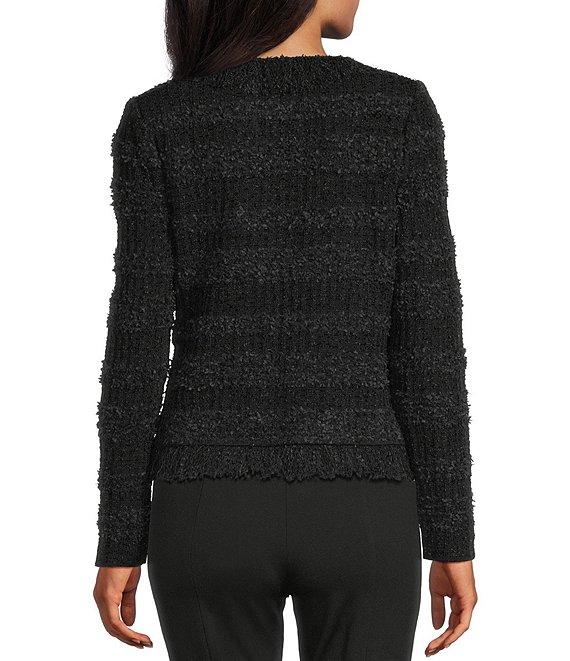 From MISOOK, this jacket features: Knit fabrication V-neckline Long sleeves Tailored silhouette Front patch pockets Eyelash fringe trim Hook front closure Approx. 23" length Acrylic/nylon/rayon/polyester Hand wash Imported.