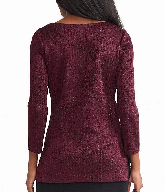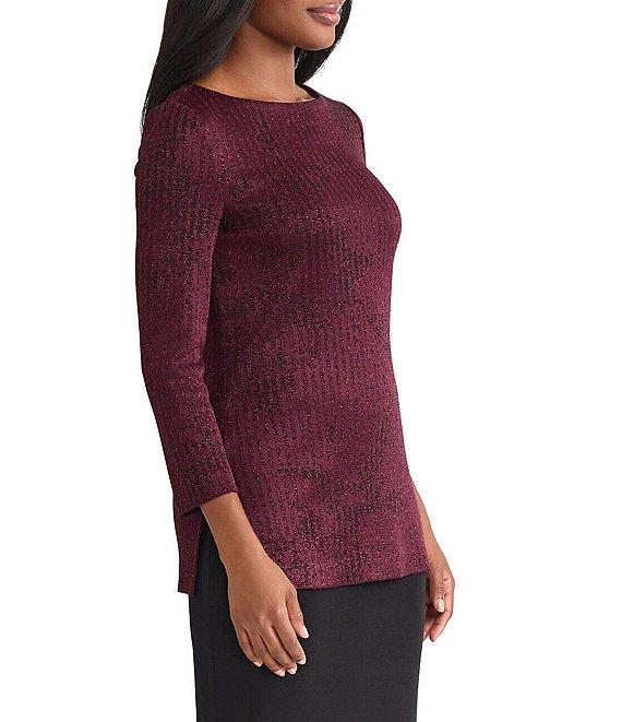 From MISOOK, this tunic features: Tonal pattern shimmer knit fabrication Tunic silhouette Boat neckline Bracelet sleeves Straight hem with side slits Pullover construction Approx. 27" length Acrylic/rayon/nylon/metallic/polyester Hand wash Imported.