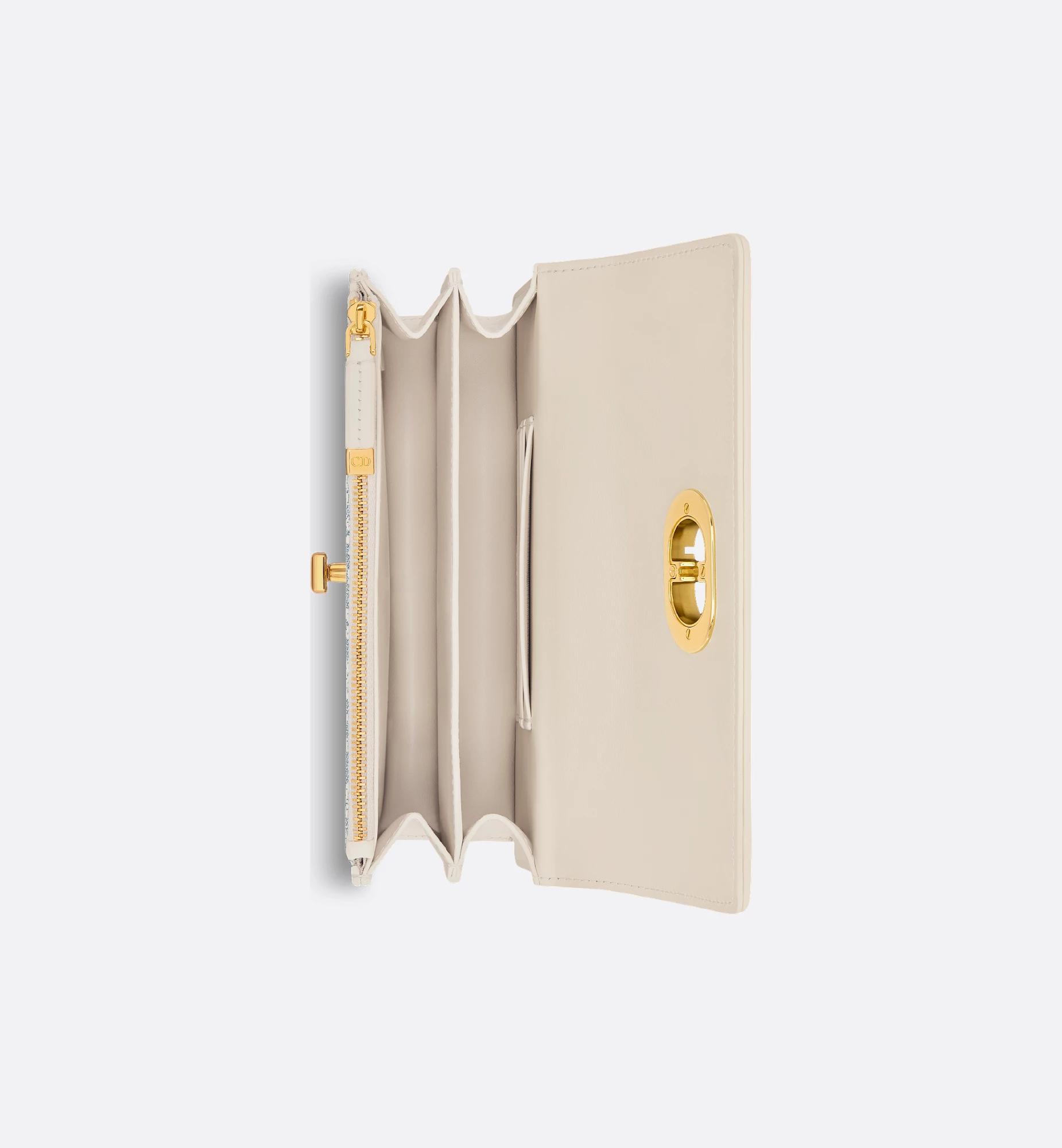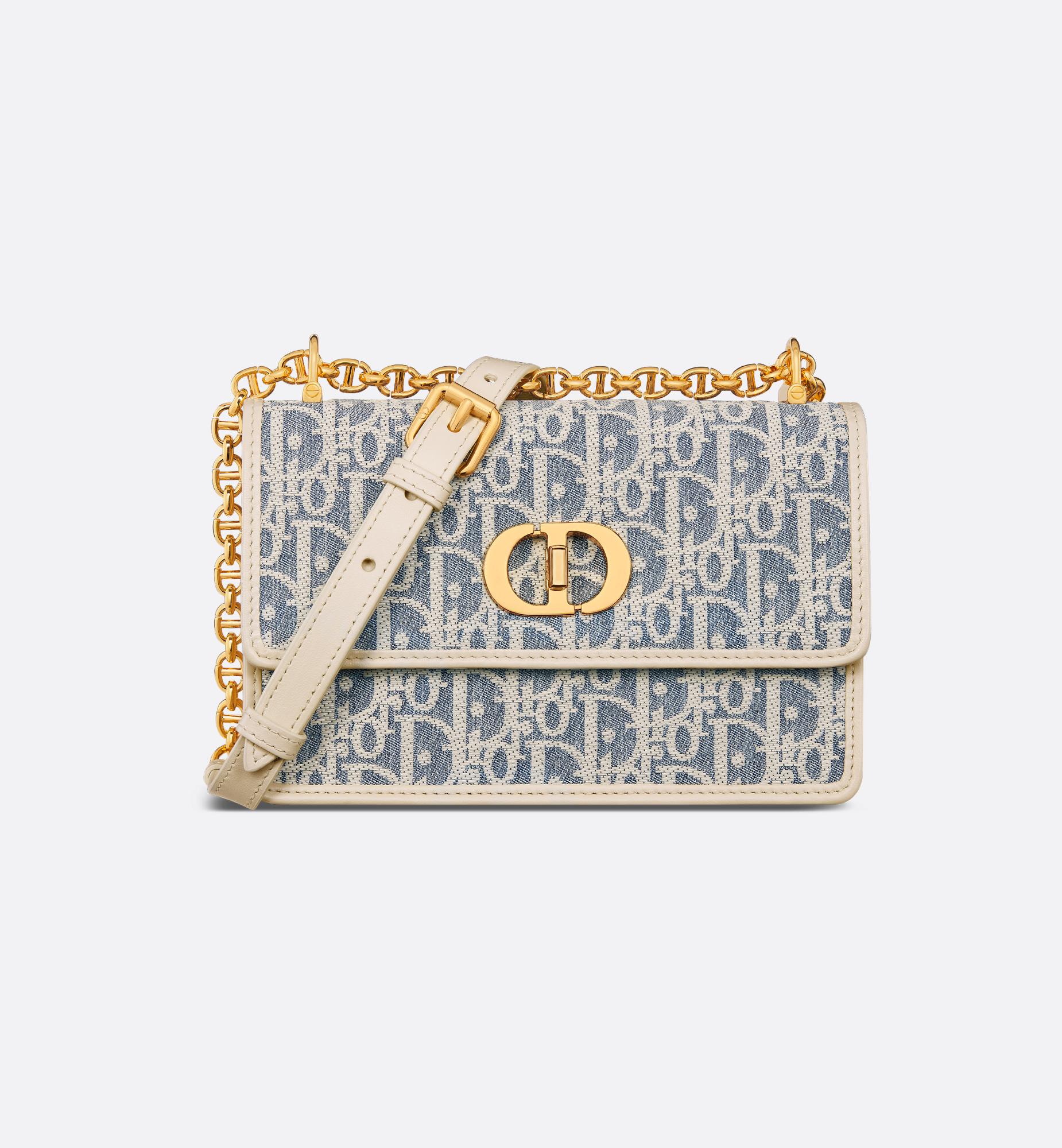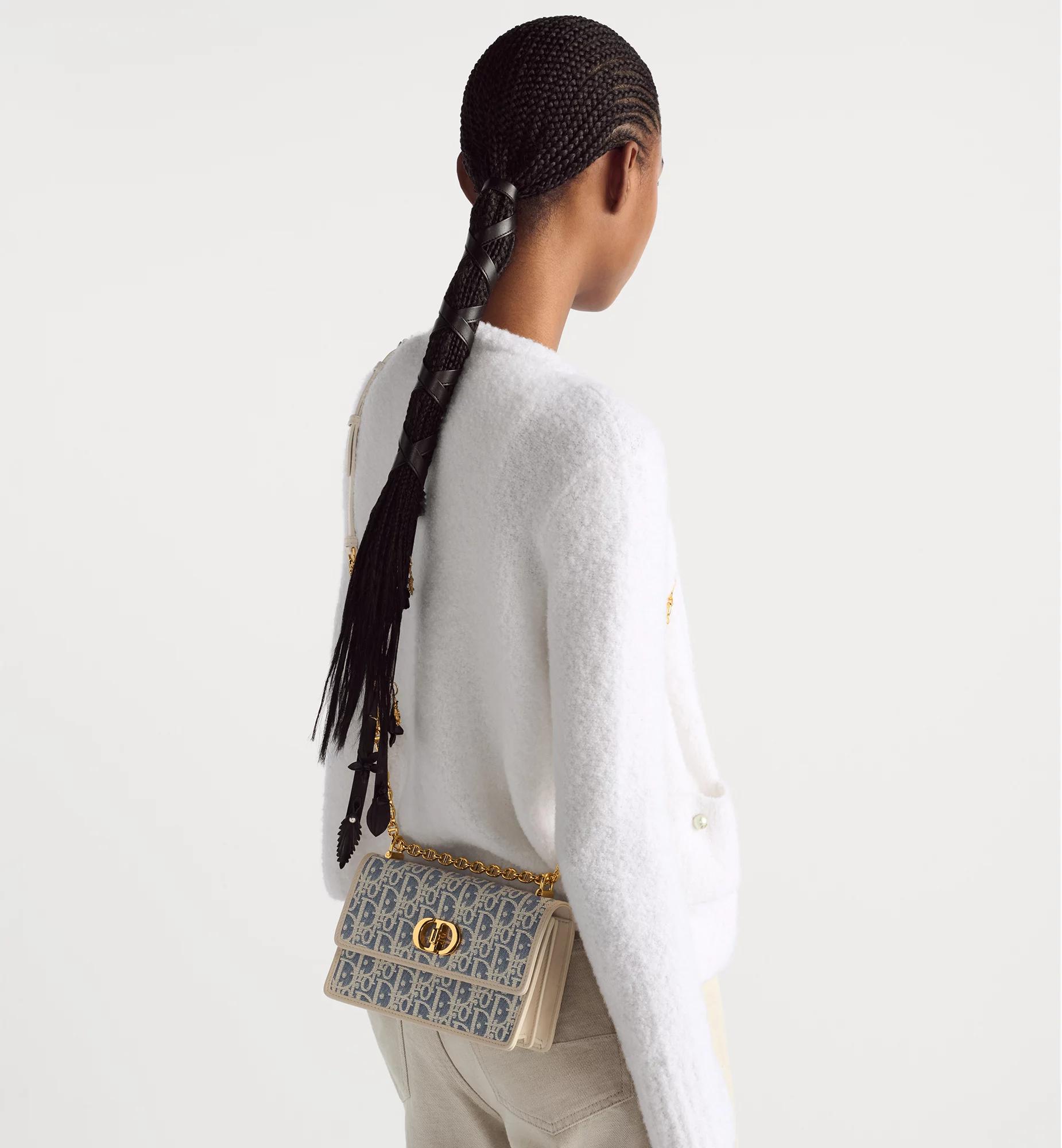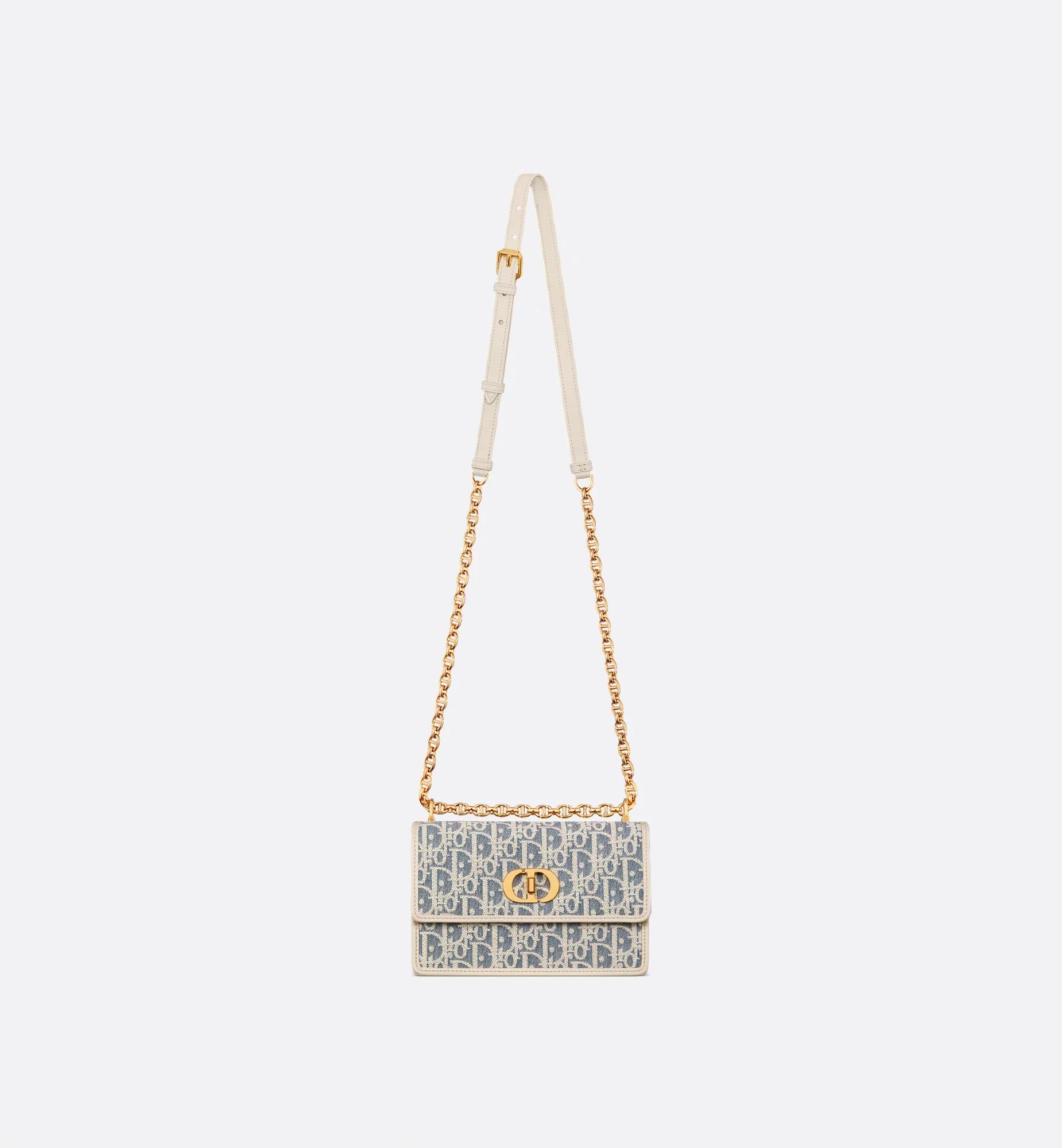 The Miss Caro mini bag expands the Dior Caro line with modern and timeless elegance. The style elegantly combines light biscuit smooth calfskin with blue chambray — a lightweight cotton denim embroidered with ultra-durable raffia thread forming the iconic Dior Oblique motif. The flap is accented by an antique gold-finish metal CD twist clasp inspired by the seal of a Christian Dior perfume bottle. Alternating between antique gold-finish metal links and tonal enamel links that match the leather, the adjustable chain shoulder strap has a leather insert for added comfort when carrying the bag by hand, wearing it over the shoulder or crossbody. Main composition: cotton, technical fabric and calfskin. Lambskin and technical fabric lining. CD twist clasp. Two main compartments. One zip compartment. Three card slots. One exterior slip pocket. Adjustable chain with antique gold-finish metal and tonal enamel CD links and leather insert. Made in Italy