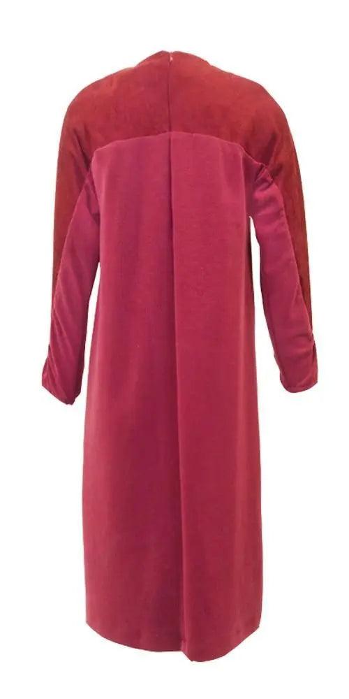 Junior sized burgundy dress with slight a-line, suede and stretch ponti fabric, with scrunched sleeves.