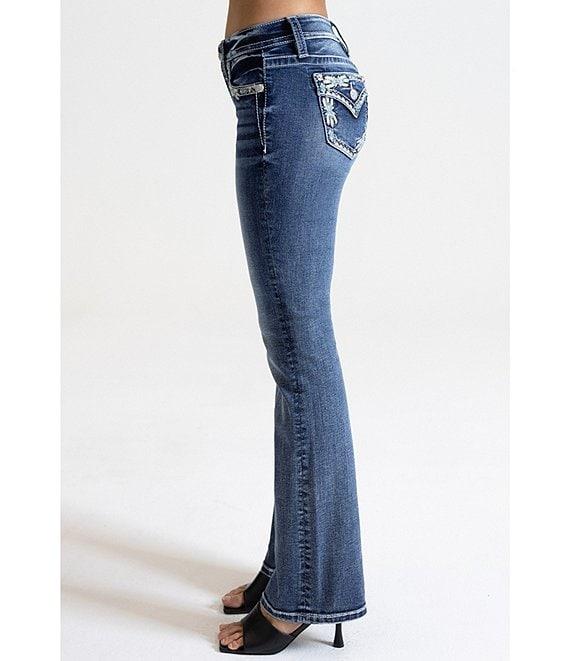 From Miss Me, these jeans feature: Mid rise Two front pockets (one with coin pocket) Two embellished back-flap pockets Zip/button-front closure Belt loops Bootcut legs Approx. 34” inseam Cotton/polyester/elastane denim Machine wash/tumble dry Imported.