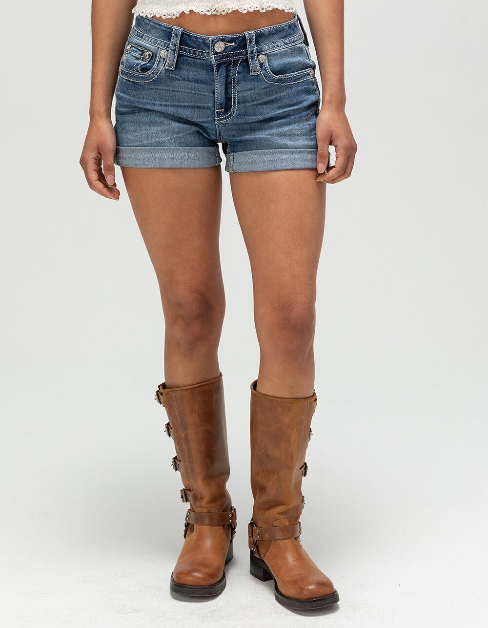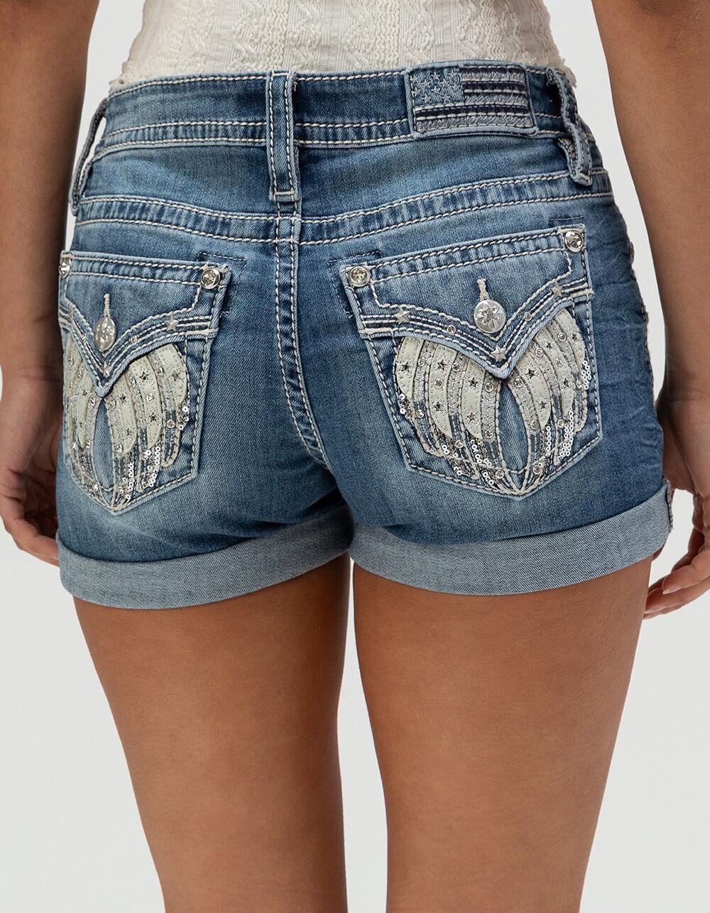 MEDIUM WASH. Miss Me Dara Wing Denim Shorts. 5-pocket denim styling. Button closure with zip fly. Belt loop waist. Mid rise. Whiskering details. White stitching. Leather applique accents with sequins, rhinestone rivets and star stud detailing. Embroidered Americana flag Miss Me brand patch. Approximate inseam: 2.5". 91% Cotton 7% Polyester 2% Elastane. Machine wash. Imported.