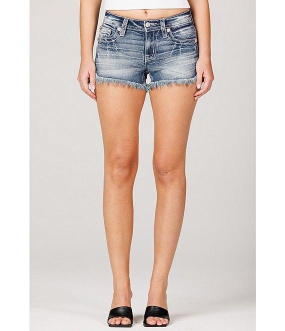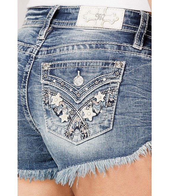 From Miss Me, these jeans feature: Mid rise short Cute flowers detail Single button-front zip Frayed hem 3.5" inseam Cotton/elastane Machine wash/tumble dry Imported