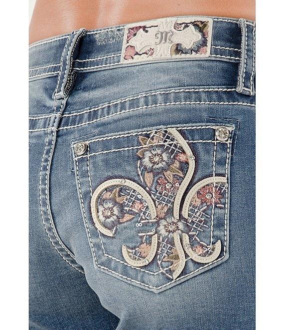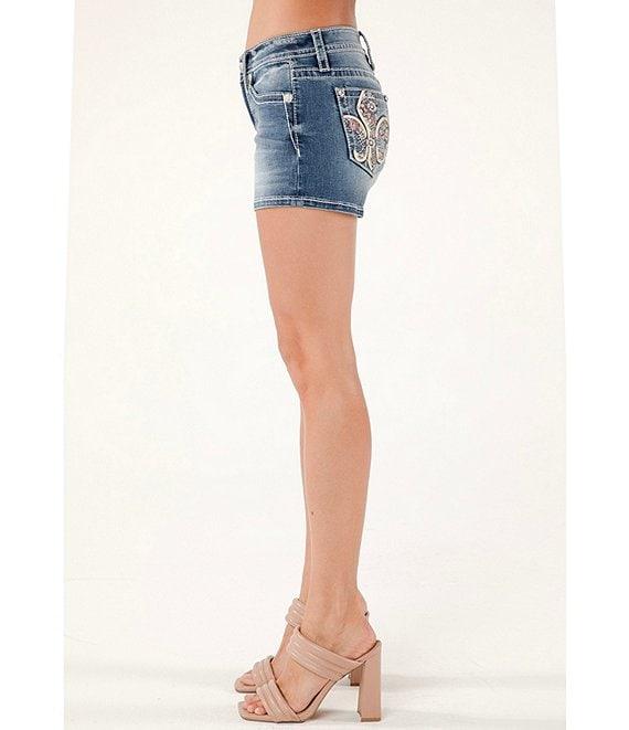 From Miss Me, these shorts feature: Mid rise 5-pocket styling Front button/zip fly closure Floral fleur de lis on back pockets Approx. 3.5" inseam Cotton blend Machine wash/line dry Imported.