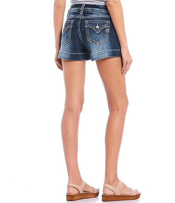 From Miss Me, these shorts feature: Denim Mid rise 5 jean pocket styling Front button/button fly 3" inseam Cotton/elastane Machine wash/line dry Imported.