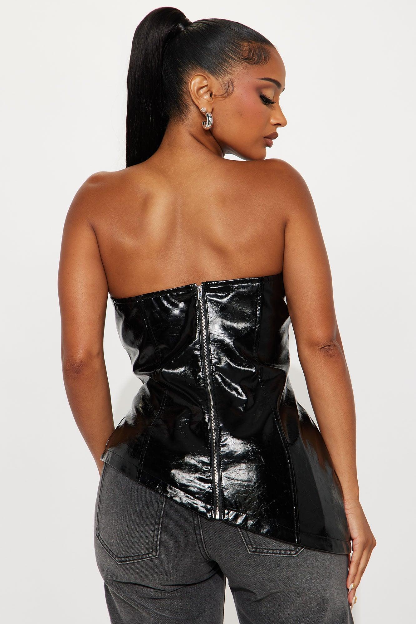 Available In Black And Wine. Tube Top Faux Patent Leather Asymmetrical Back Zip Closure Fully Lined Non Stretch Shell Coating: 100% Polyurethane Backing: 100% Viscose Lining: 100% Polyester Imported California Proposition 65WARNING: Cancer and Reproductive Harm - www.P65Warnings.ca.gov.