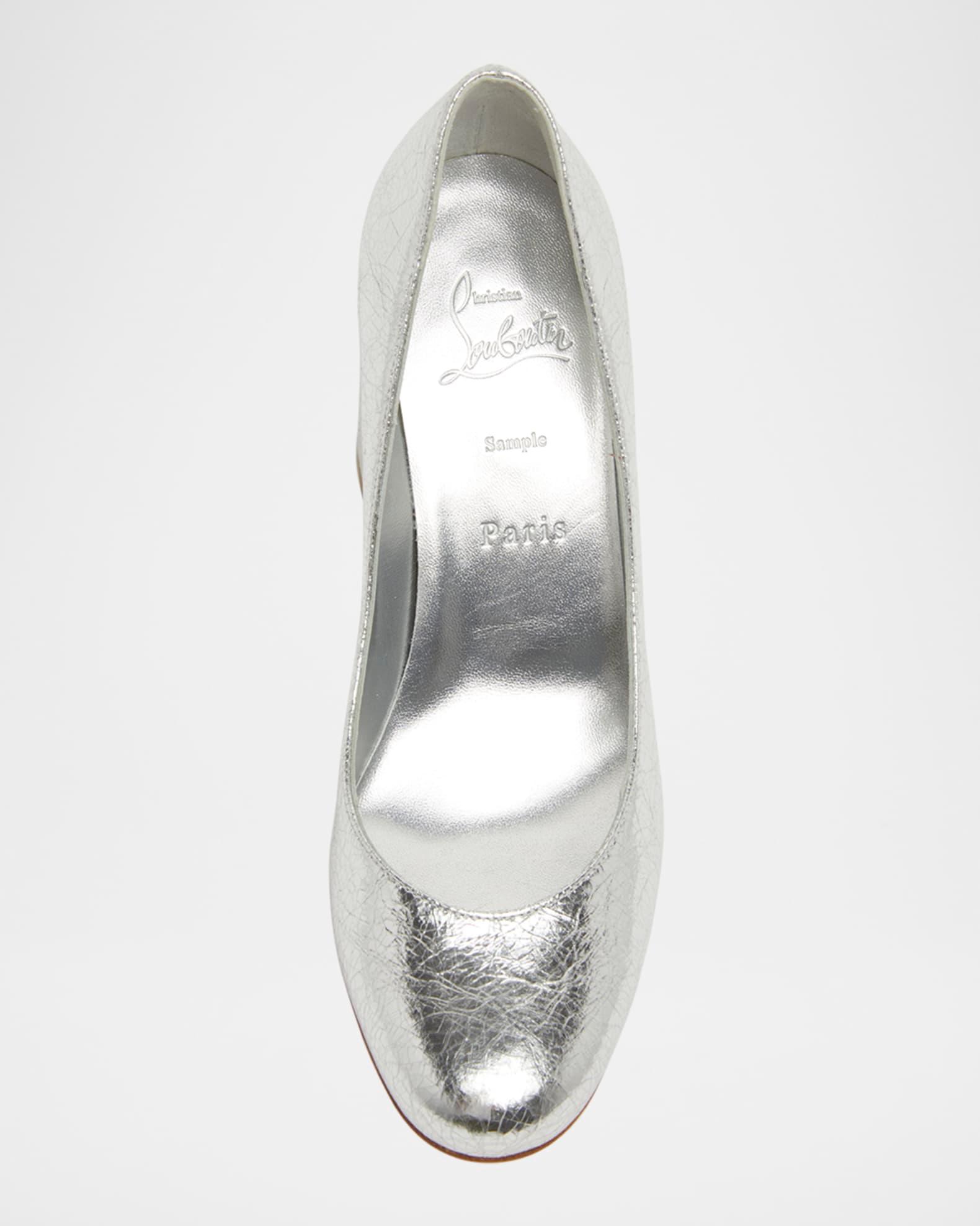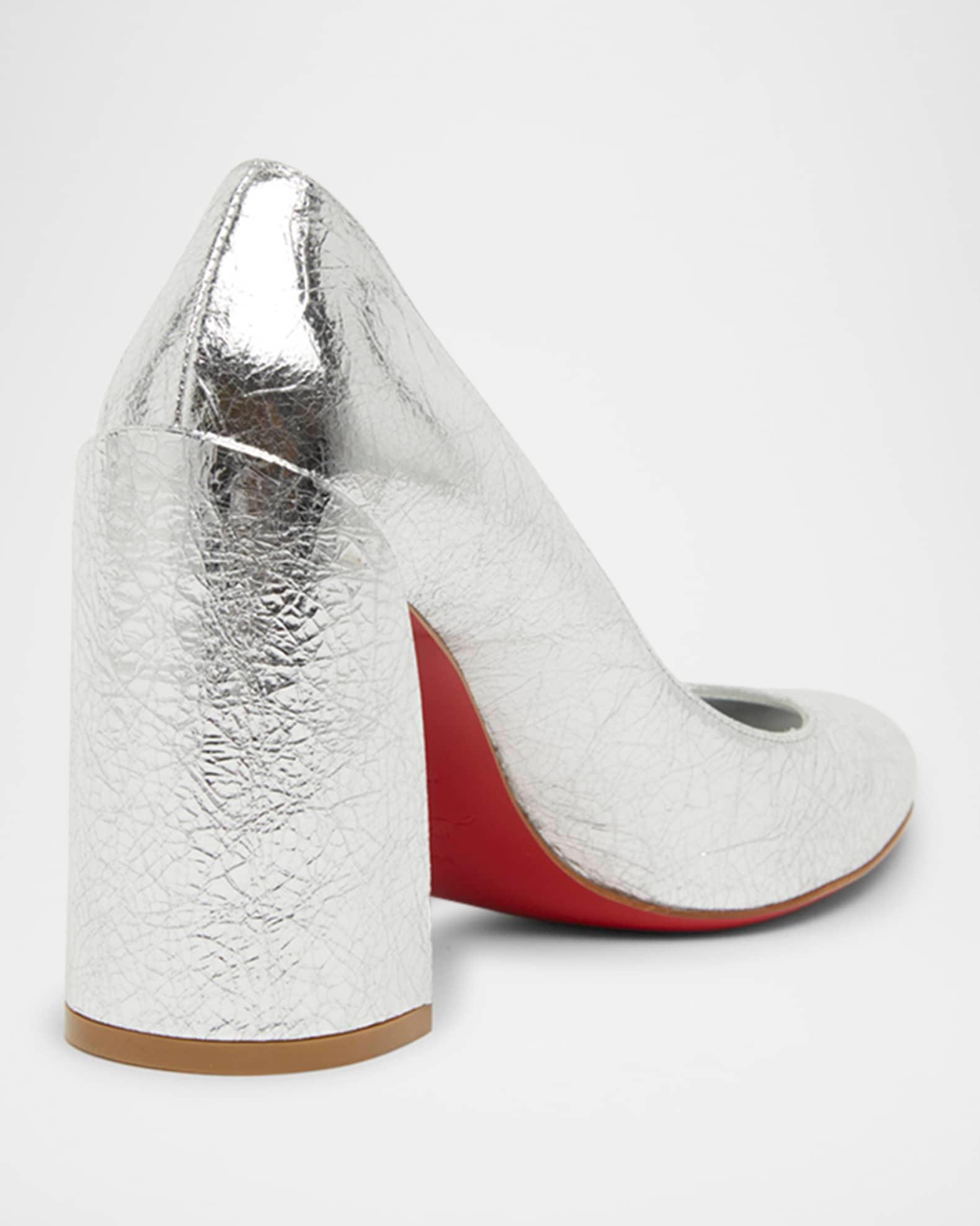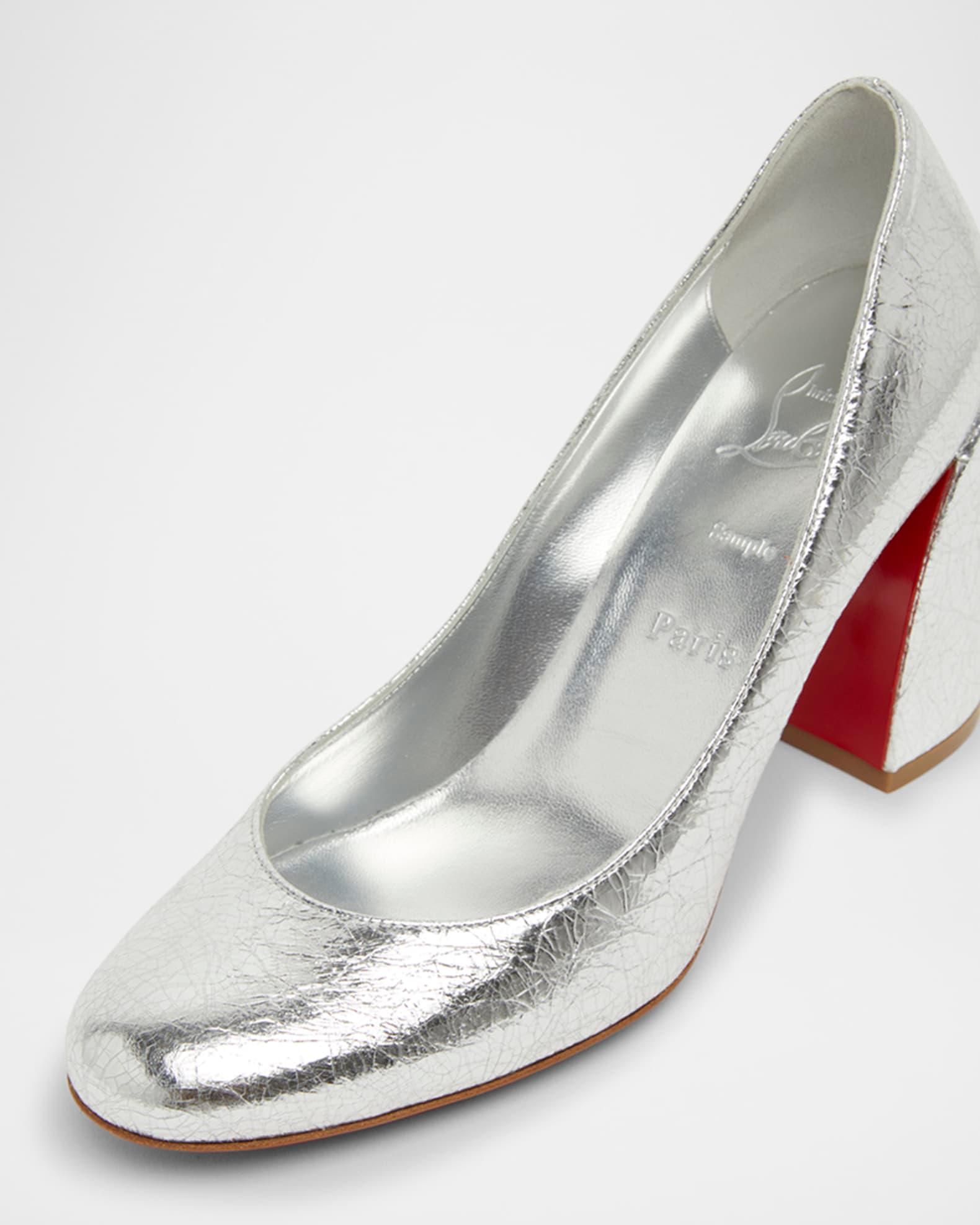 Christian Louboutin "Miss Sab" crackled metallic leather modern pumps 3.25 in / 85 mm covered block heel Round toe Slip-on style Signature red leather outsole Made in Italy