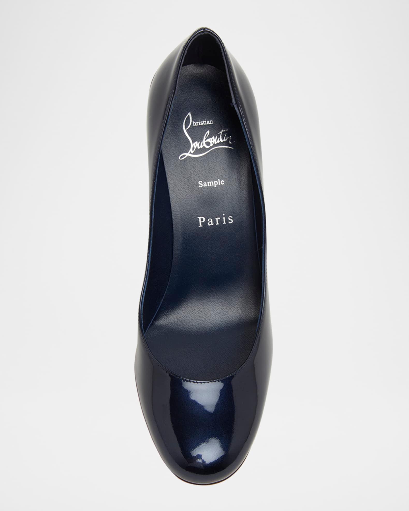 Christian Louboutin "Miss Sab" glossy patent calf leather modern pumps 3.25 in / 85 mm covered block heel Round toe Slip-on style Signature red leather outsole Made in Italy