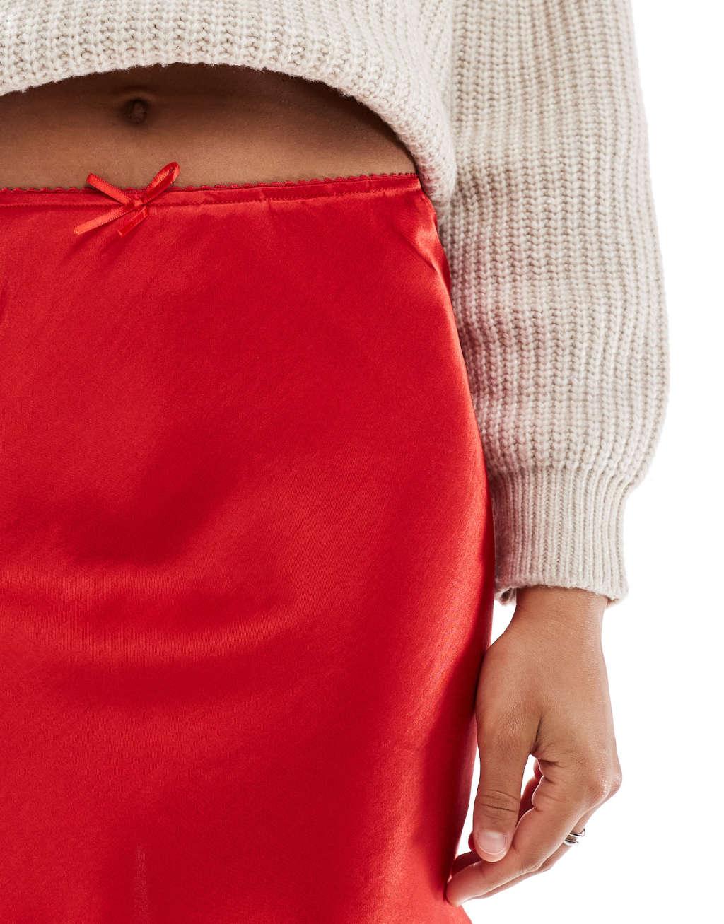 Miss Selfridge satin bias mini skirt with bow in red