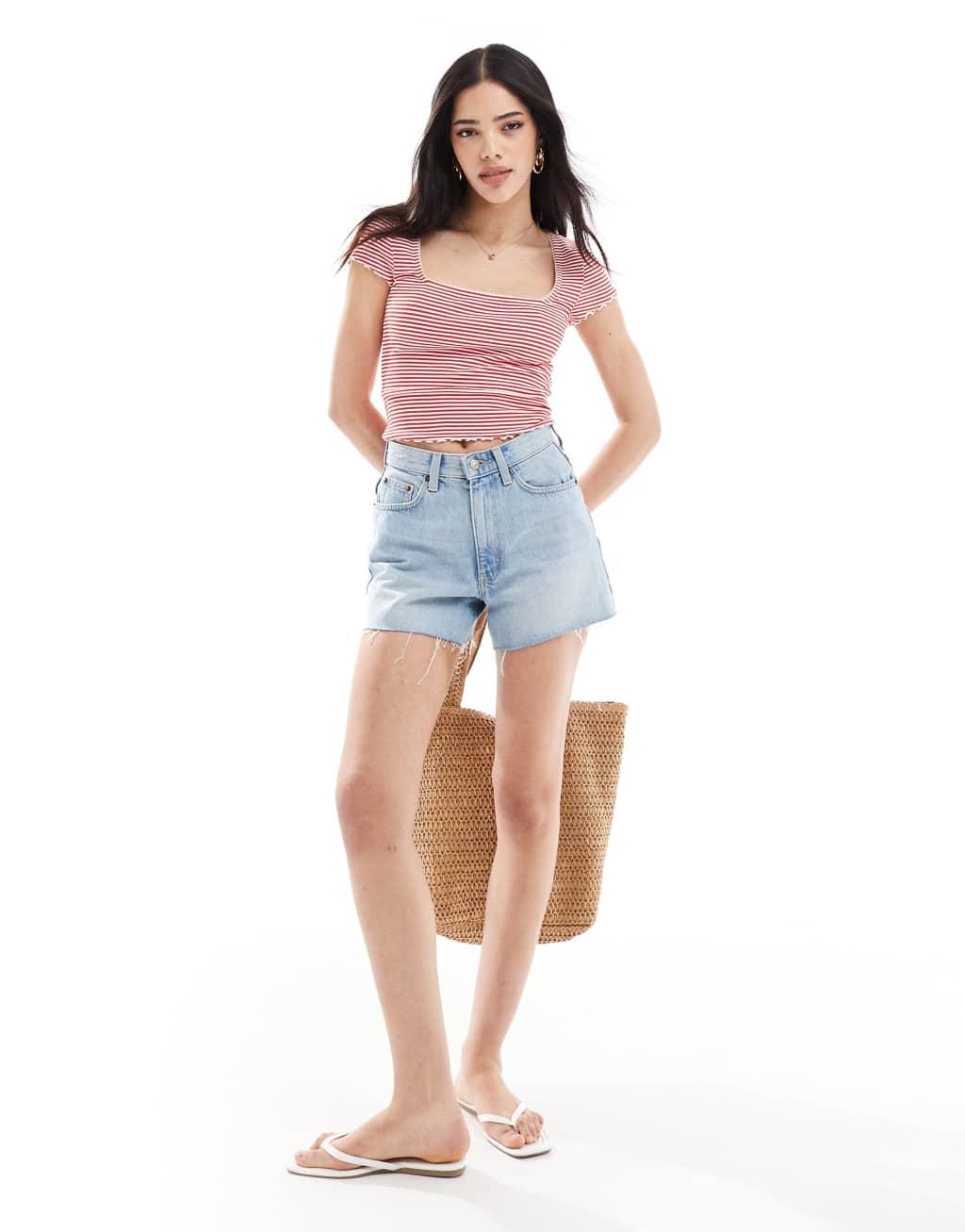 Top by Miss Selfridge Stripe design Square neck Cap sleeves Lettuce-edge trim Regular fit