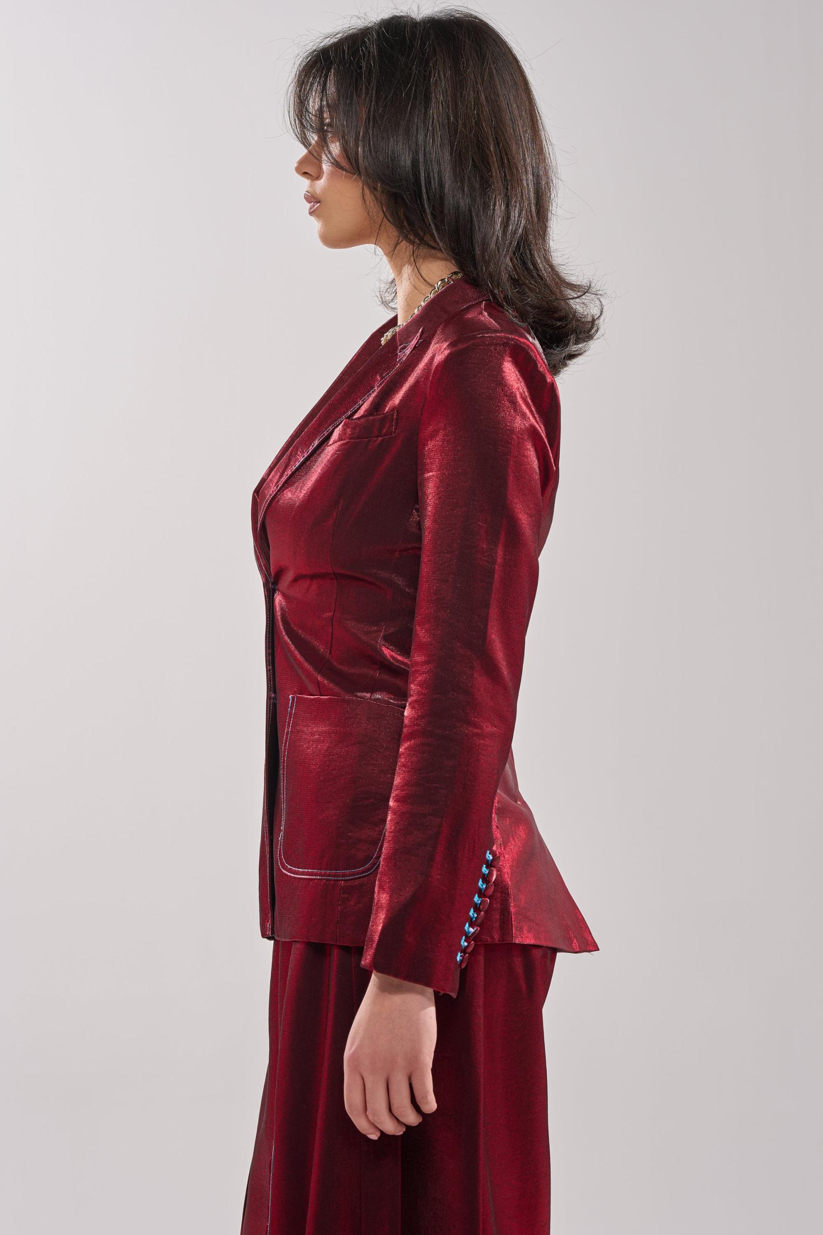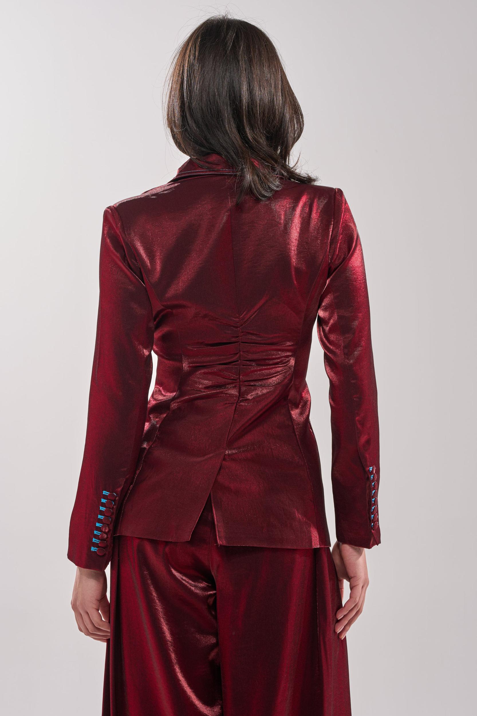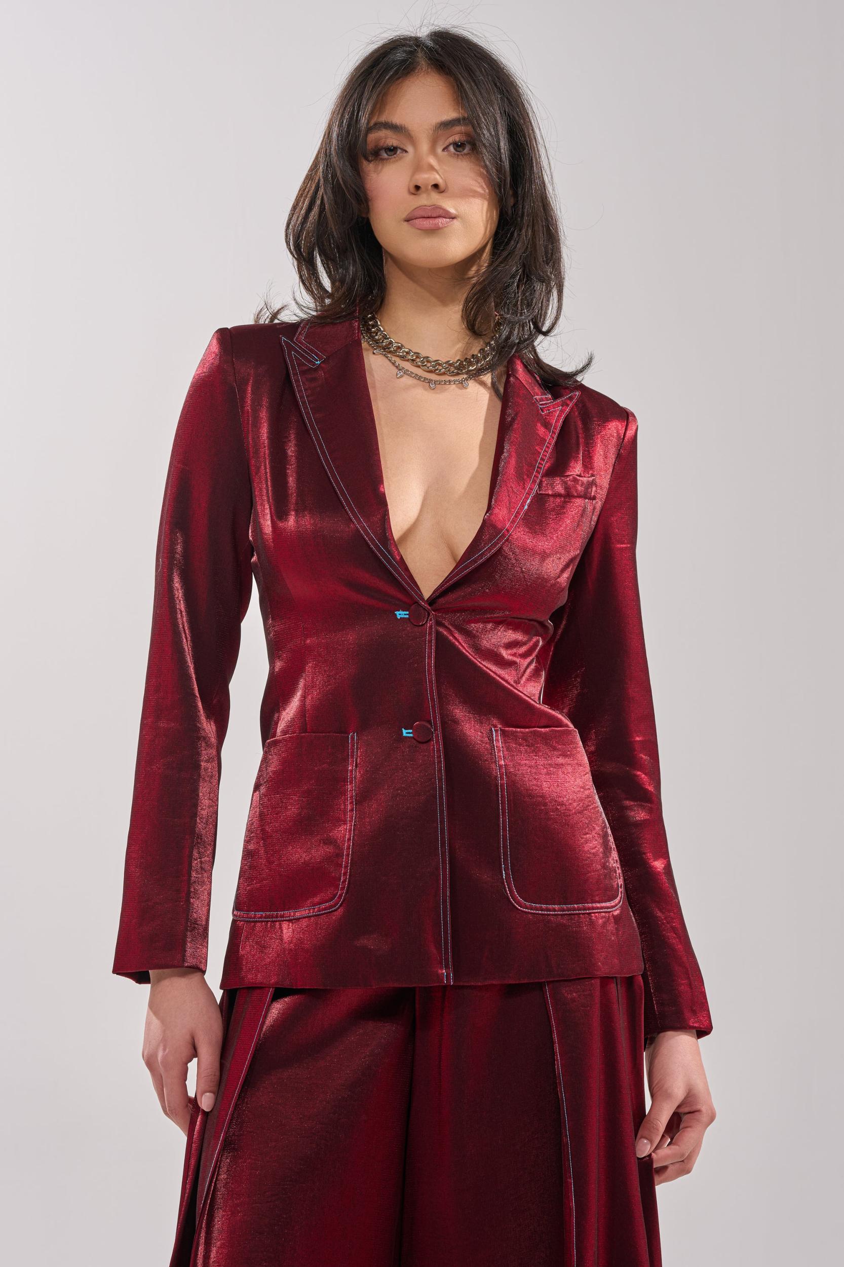 Elevate your wardrobe with the AKIRA Label Miss You Most Blazer, crafted from a luxe, satin-finish fabric that delivers a rich sheen and modern sophistication. Designed with a sharp notched lapel, structured padded shoulders, double-button front enclosures, and electric blue contrast stitching, this fitted blazer accentuates the waist with back ruching for a flattering, structured silhouette. Finished with accent buttons at the cuffs, deep front pockets, and a back vent slit, this piece is perfect for power dressing, evening wear, or upscale events. Style with the coordinating AKIRA Label Miss You Most Wide Leg Pant for a complete look. - Main Fabric: 80% Rayon 20% Nylon, Lining: 98% Polyester 2% Spandex- Hand Wash Cold- No Stretch- Imported (all measurements are approximate from size small)- 26” Shoulder to Hem- 15” Shoulder to Shoulder- 24” Sleeves (each)- Model is 5’9.5” and wearing size smallProduct ID: 1076701 (all measurements are approximate from size 1X)- 29” Shoulder to Hem- 17” Shoulder to Shoulder- 25” Sleeves (each)Product ID: 1076705
