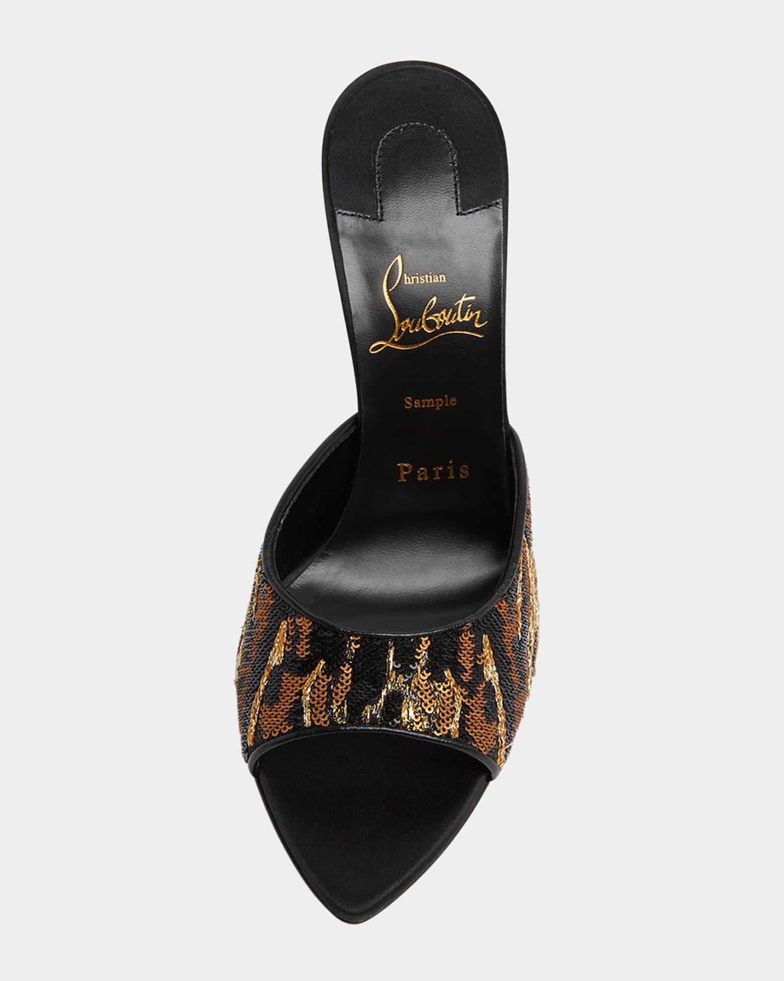 This model features a new 'Everlasting Red Sole' thanks to an innovative coating technique that ensures resistance and lasting vibrancy for our signature Louboutin red. Christian Louboutin animal-print sequined leather mule sandals 4.00 in / 100 mm stiletto heel Pointed open toe Slide style Padded insole with a slightly roomier fit Signature red leather outsole Lining: Leather Made in Italy