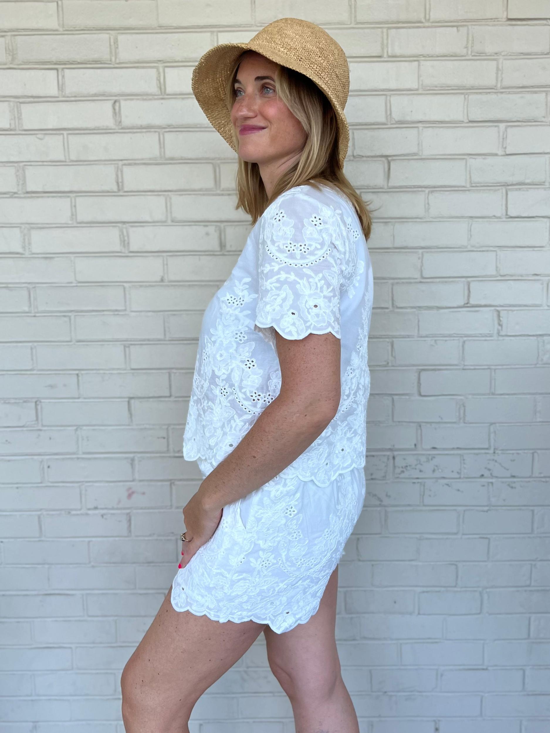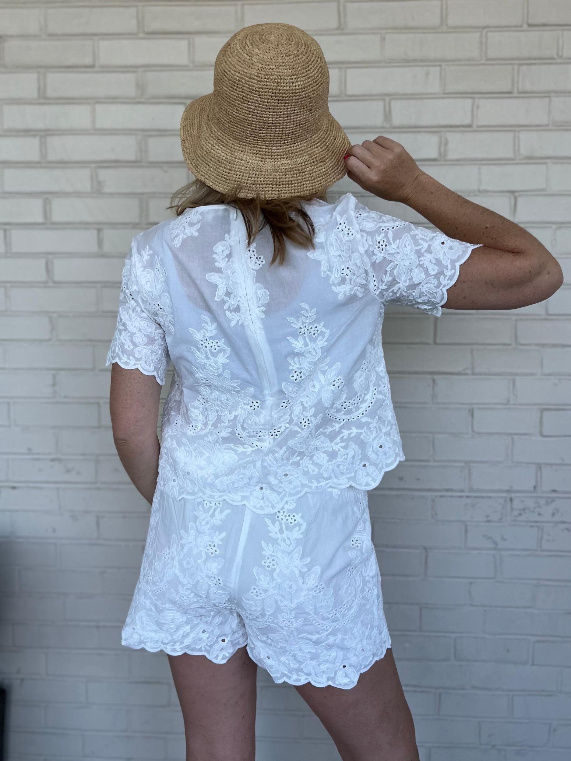 Get ready to look effortlessly chic in the Misty Top! This white top features delicate floral lace accents and scalloped edges on the sleeves and bottom, adding a touch of elegance to your outfit. With a discreet zipper in the back, this top combines style and convenience. Dress it up or down for any occasion.