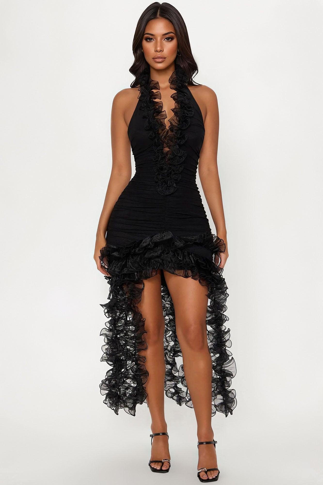 Available In White And BlackMesh Mini DressDeep V-Neck Halter Ruched Ruffle Detail Draped Tiered Hem Backless Back Zipper Lined Stretch Length Measured Flat = 32" Self:92%Polyester 8%Spandex Contrast 1:50% Polyester 50%Nylon Contrast 2: 100%Nylon Lining:100%Polyester Imported