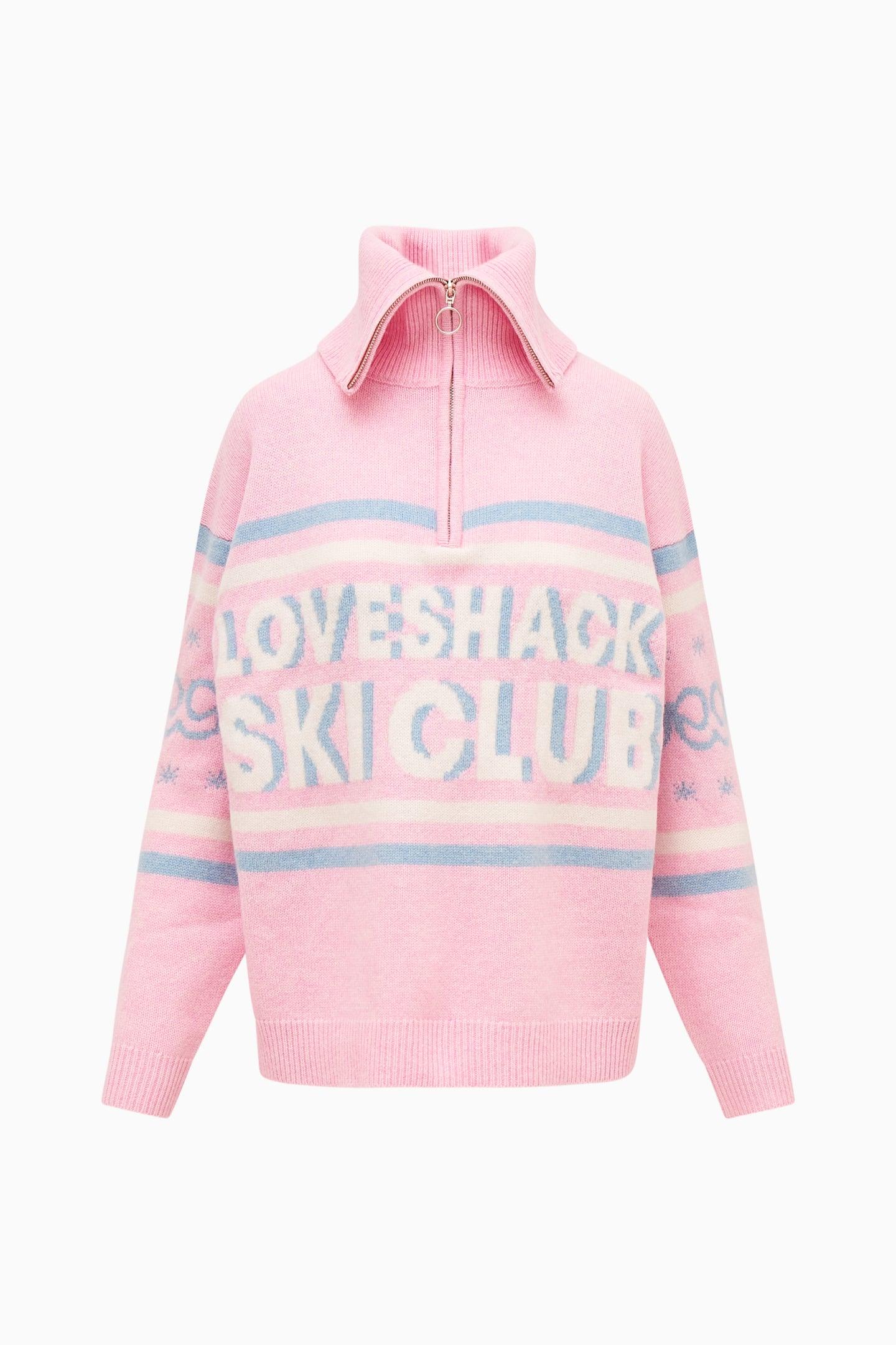 The Mitsy Sweater is a cozy, oversized take on classic ski-inspired style. Crafted from 100% merino wool, it features a quarter-zip with a tall ribbed neck and fold-over collar, playful jacquard ski club graphics, and a relaxed, oversized body with dropped shoulders and longer length. Ribbed trims finish the silhouette for structure and polish. A warm, festive sweater that mixes classic alpine charm with effortless, playful layering. 100% Extrafine Merino Wool Quarter-zip with tall ribbed collar Oversized, dropped shoulder silhouette with longer length