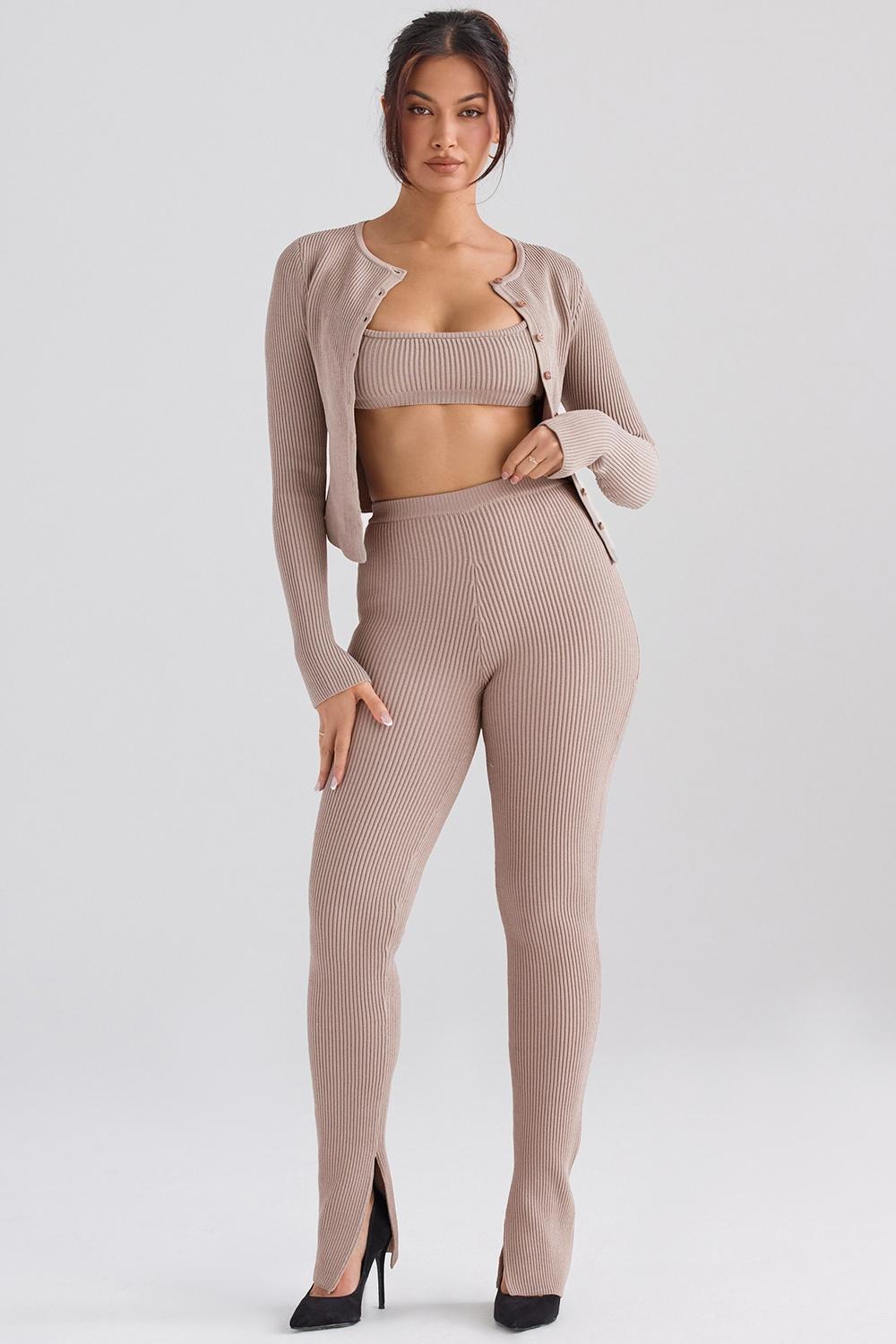 'Mitzi' leggings in taupe and a chunky knit cardigan.