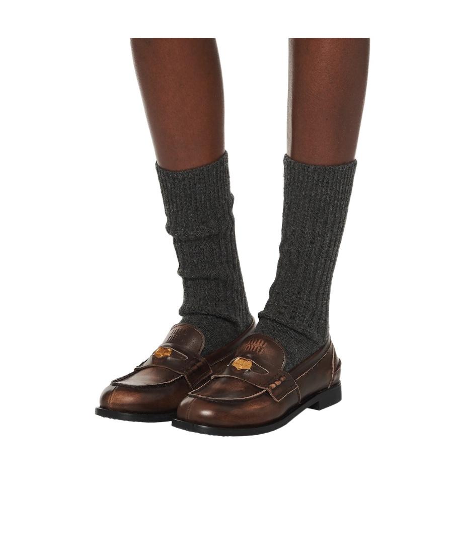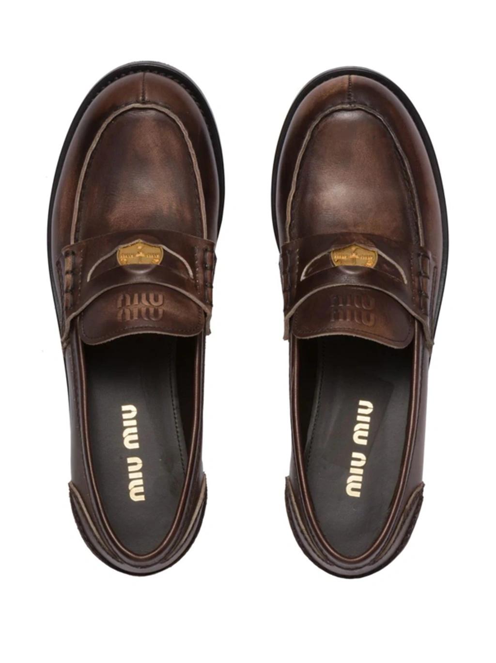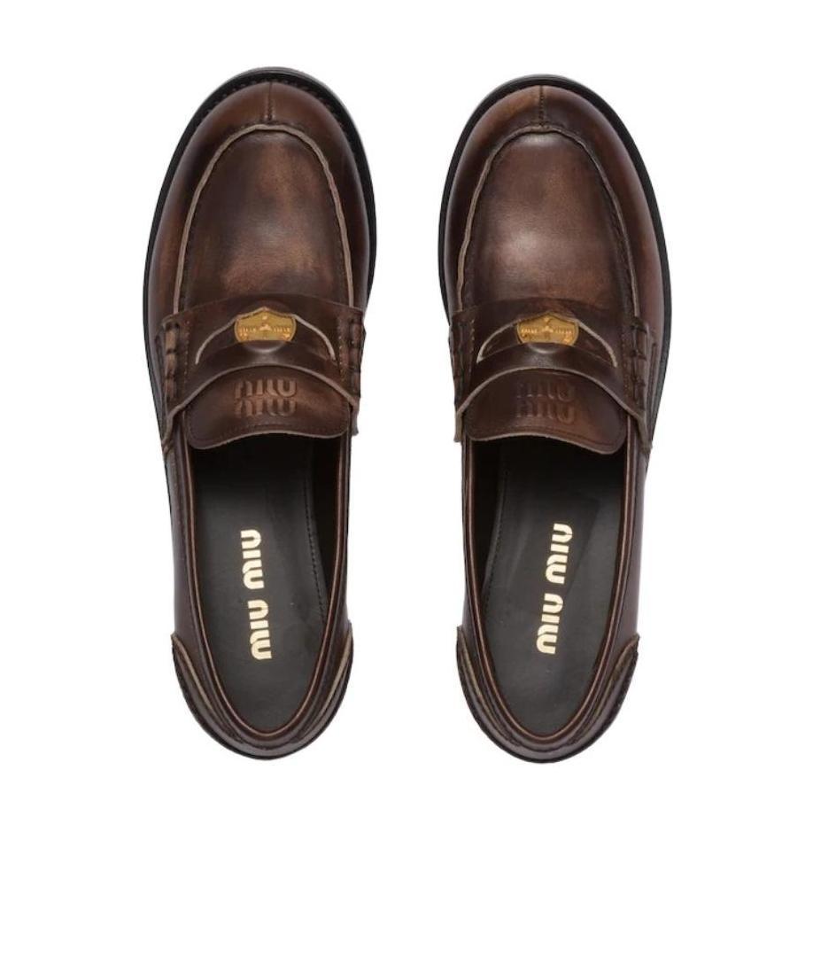 Shop Miu Miu Leather Distressed Penny Loafers In Brown from 800+ stores, starting at €900. Miu Miu Penny Loafer in Burgundy High gloss leather upper and manmade sole. Made in Italy. Slip-on styling. Branded coin inserted at keeper strap. Approx 13mm/ 0.75 inch heel. MIUF-WZ166. 5D773D. About the designer: Established in 1992 by Miuccia Prada, Miu Miu reflects fashion forward, light-hearted, and provocative women. The language of Miu Miu experiments with contemporary femininity, merging rebelliousness with minimalism in order to evoke a sense of freedom within luxury fashion. As a member of the Prada family, Miu Miu is made for those who aspire to add a flair of the avant-garde to their lifestyle.