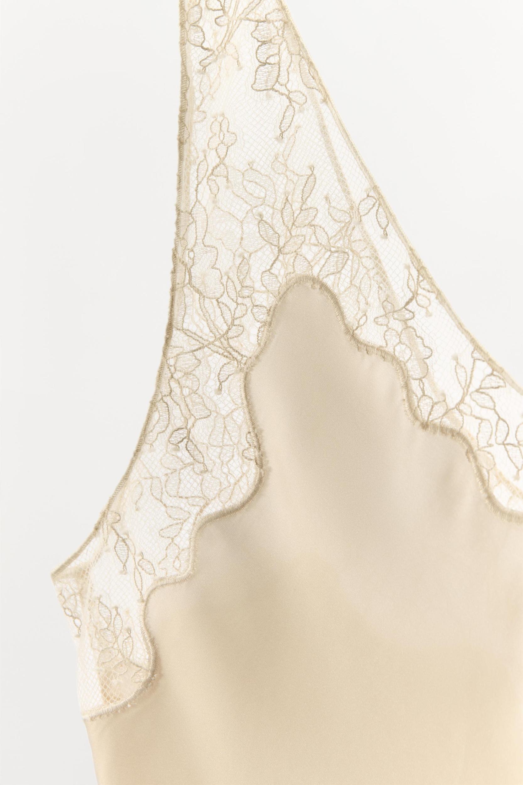Satin cami top. Round neckline and wide straps. Tonal lace appliqué detail.