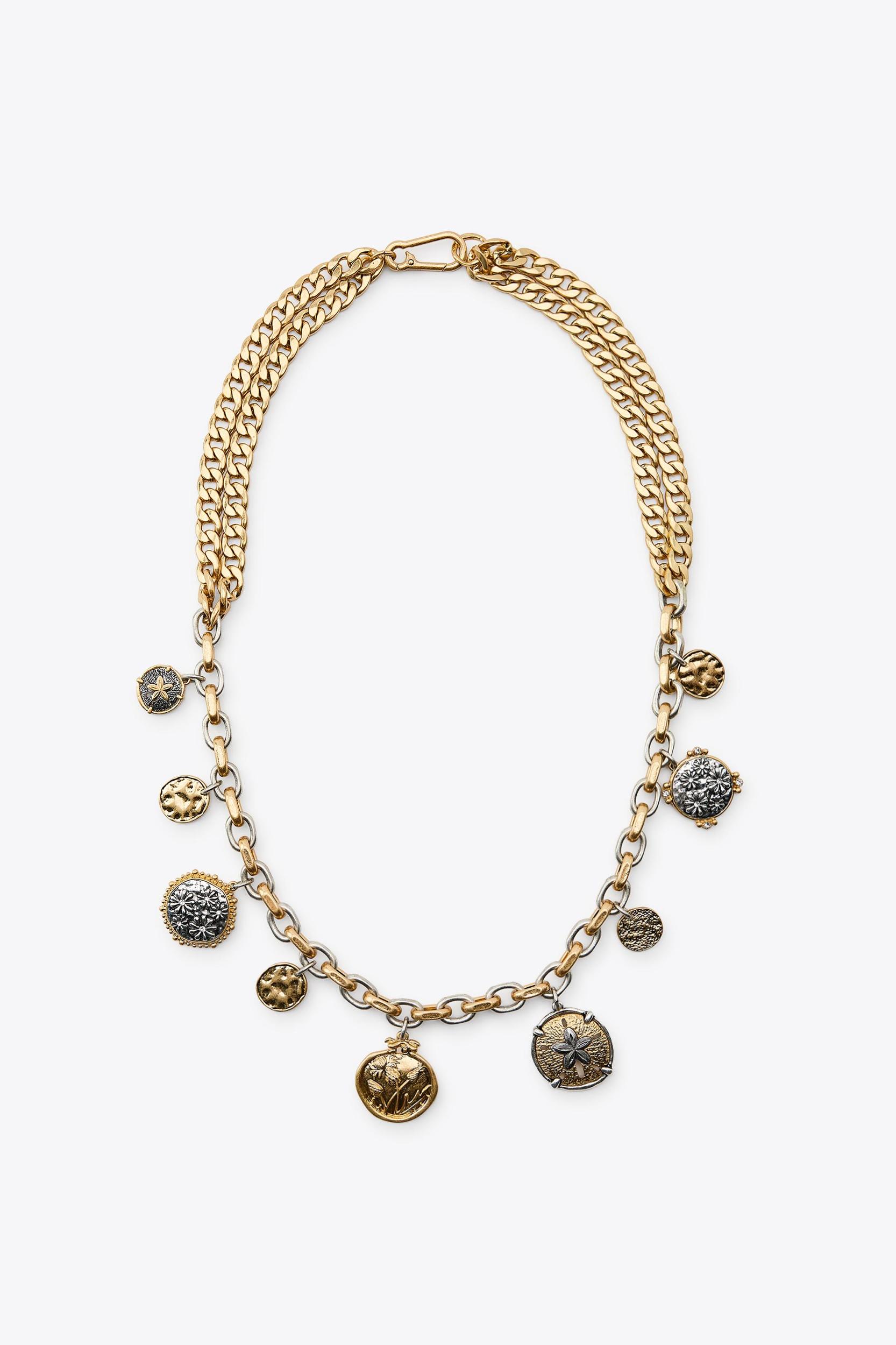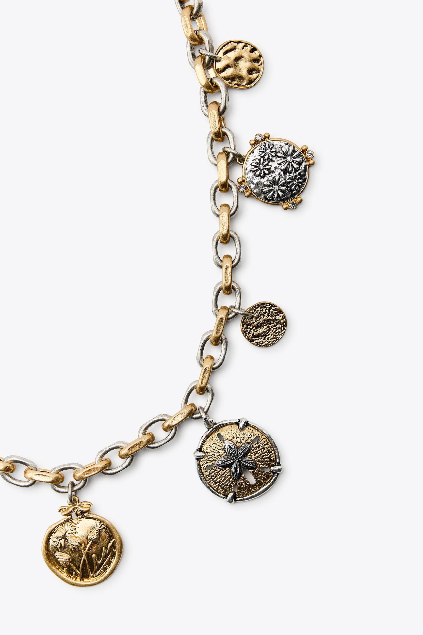 Metal link belt with mixed coin pendants. Lobster clasp closure.