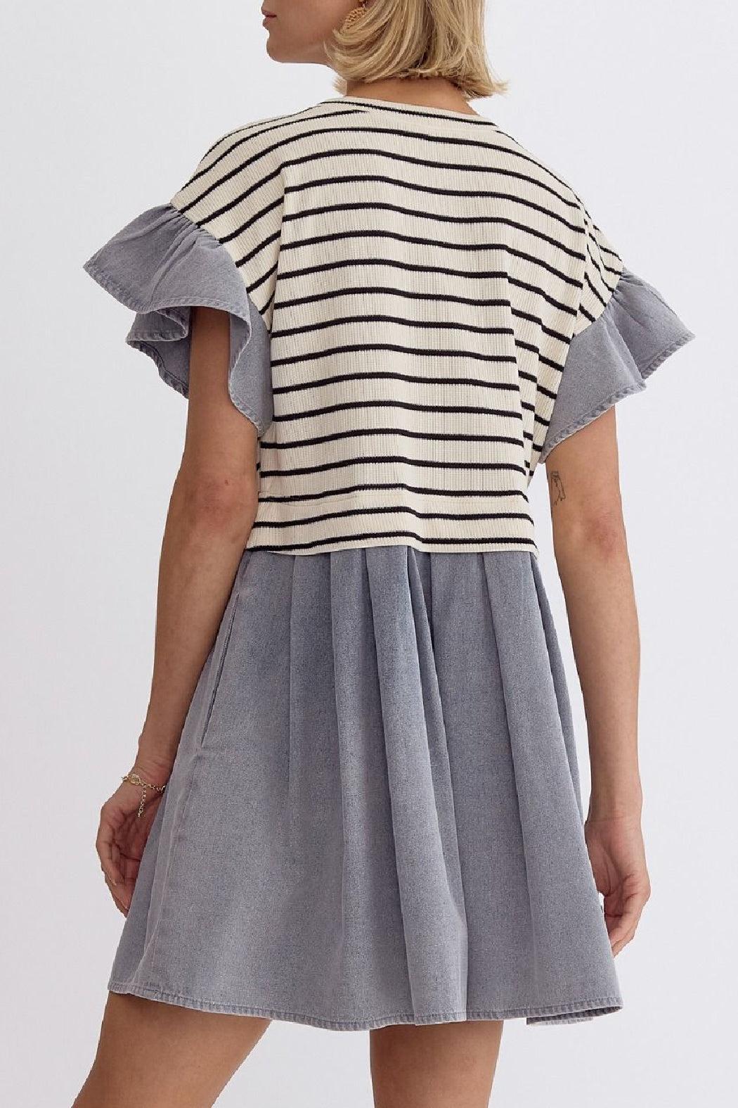 Such an easy dress to wear in Spring, Summer, and Fall! This short sleeve dress has a striped knit body with an attached denim skirt and denim flutter sleeves. It has pockets at the sides and has a great flowy fit. Pair with a wedged metallic sandal for a dressier event or dress down with a fashionable sneaker. It will also be great with booties in the Fall.
