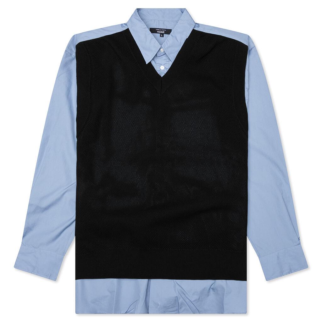 The Mixed Material Shirt from Comme des Garcons Homme offers a unique two-in-one silhouette. Crafted from 100% cotton for the main body with an attached 100% polyester vest overlay, it delivers the look of layered styling with the ease of a single piece. The shirt features a standard collar, full button front, and long sleeves with adjustable arm cuffs. Main: 100% Cotton Attached Fabric: 100% Polyester Button up shirt with vest silhouette Standard collar Button front Adjustable arm cuffs Long sleeve Style No: HO-B010-051-1