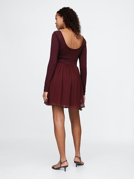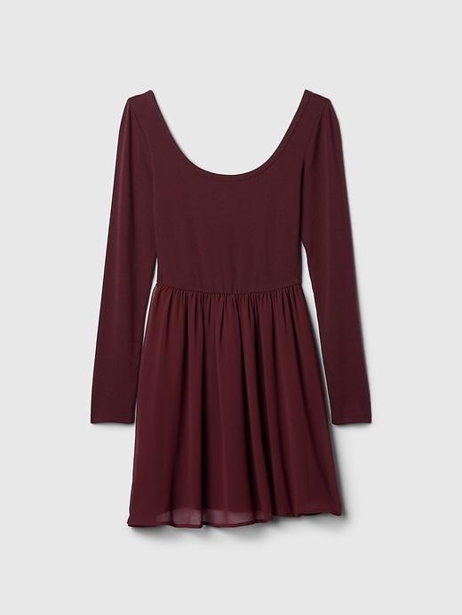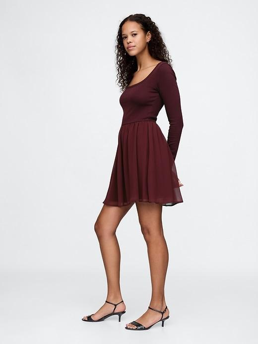 Soft, stretch knit and poly mixed media mini dress. Ballerina neckline. Long sleeves. Pleated detail at lined skirt. This dress's skirt is made with 100% recycled polyester. Compared to virgin materials, using recycled materials helps to reduce resource use and waste. #588732
