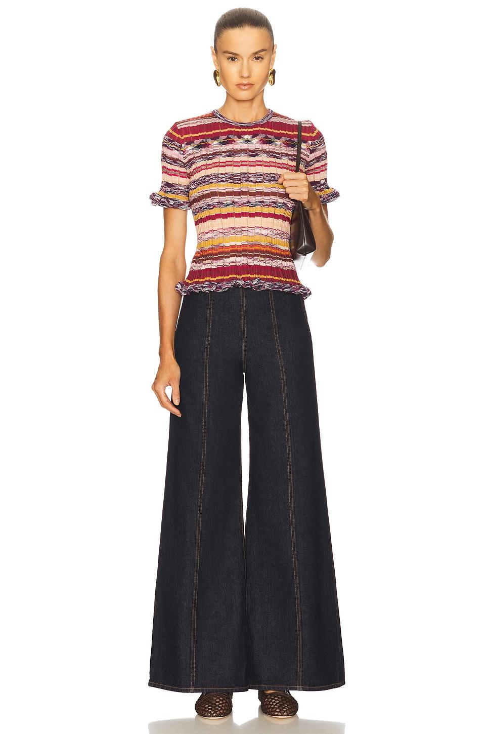 50% rayon, 40% cotton, 10% lycra. Dry clean only. Pull-on styling. Ruffle trim. Midweight knit fabric. Garment is made with a semi-sheer fabric, undergarments can show through. Made in China. Revolve Style No. ULLA-WS478. Manufacturer Style No. PF250729.
