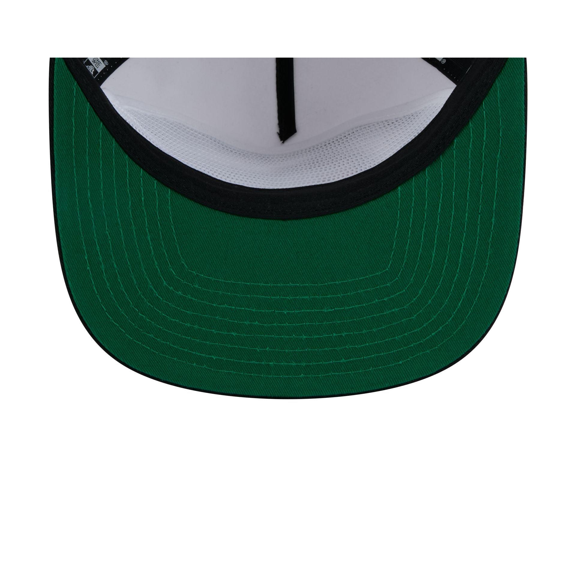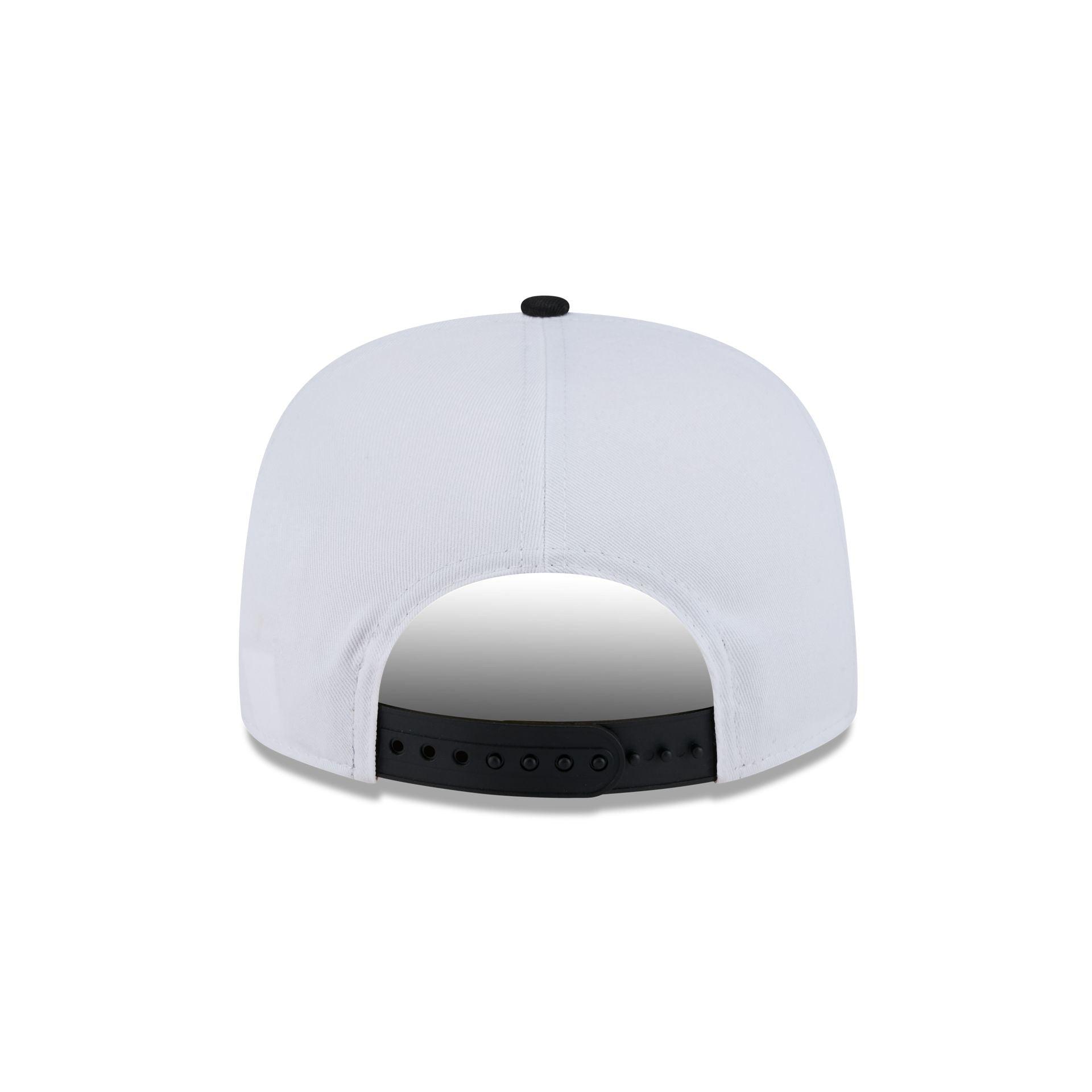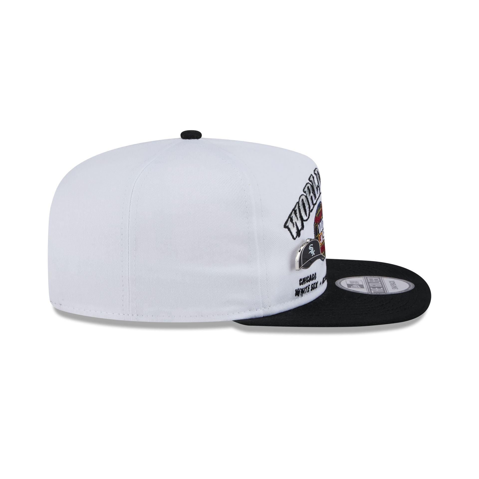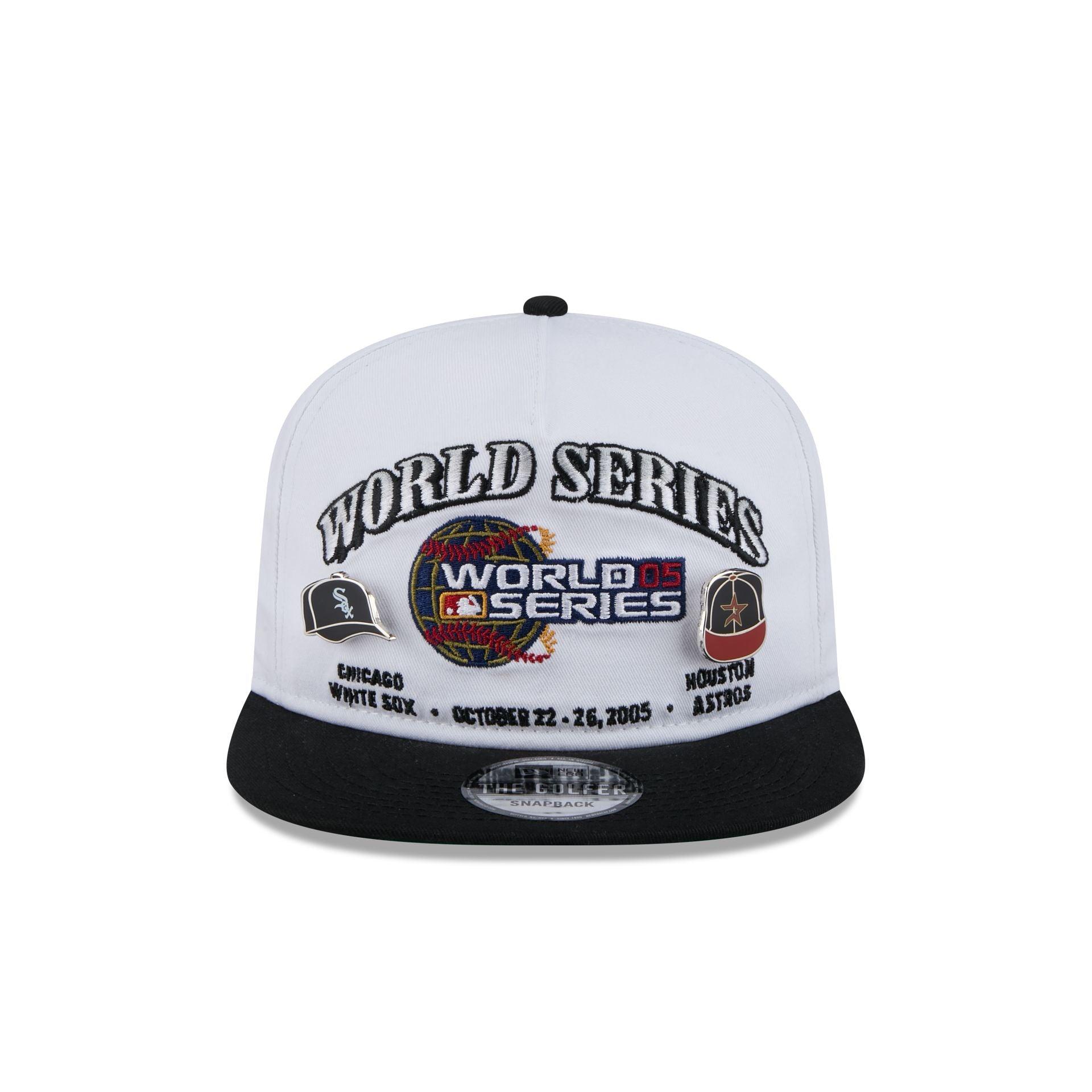 The MLB World Series 2005 Championship Pin Golfer features an embroidered 2005 World Series patch with dueling Chicago White Sox and Houston Astros pins and team wordmarks at the front panels. Additional details include a black visor with green undervisor and an adjustable snapback closure at the rear.