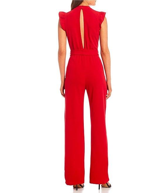 From Moa Moa, this jumpsuit features:Mock necklineFlutter sleevesButton/loop closure at back of neckSelf tie at waist(2) x side pocketsKeyhole back detailWide, full length legsPull-on stylingPolyester/spandexMachine wash/tumble dryImported.