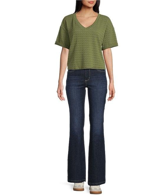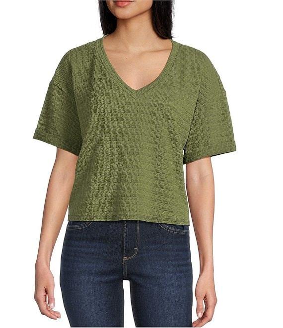 From Moa Moa, this top features: Allover stripe V-neck Short sleeves Cropped Pullover styling Polyester/cotton/spandex Machine wash/tumble dry Imported.