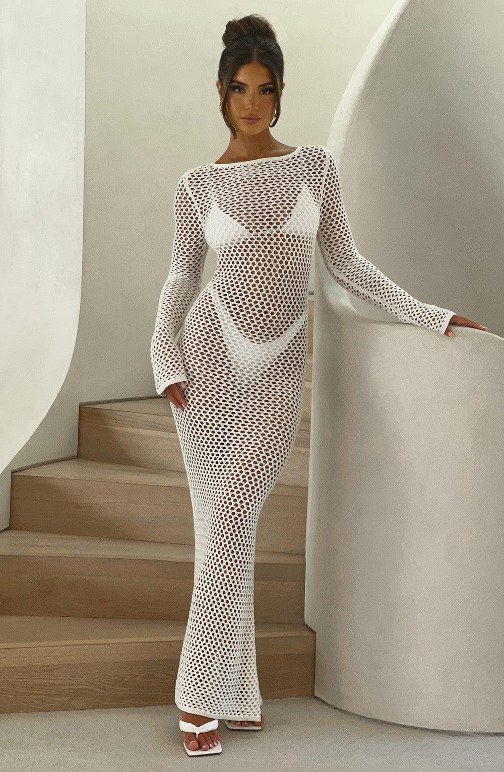 Long, balmy days that turn into nights call for Moana, our premium sheer knit maxi with an eye-catching low back and high neckline. This stunning design is super flattering with long flared cuffs.. Pair with soft, textured hair, golden accessories and heeled sandals. Colour: White. Sheer knit fabric. Long sleeves with flared cuffs. Tie at top of neck. Super low back. High neck. Maxi length. Model is an XS and is wearing an XS.