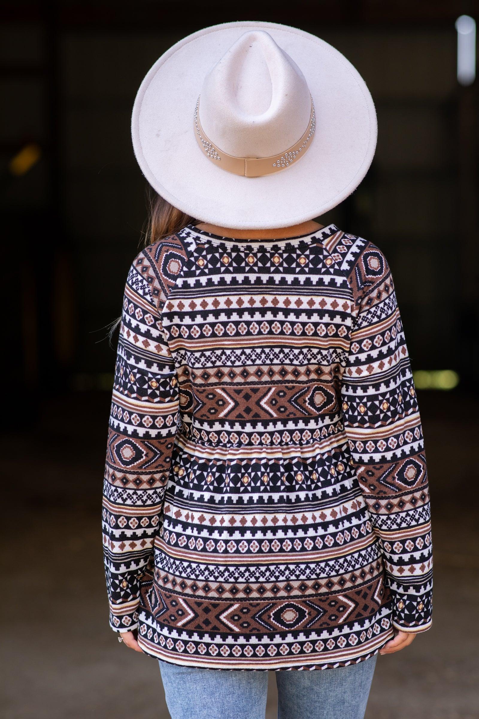 Product Details Colors: Mocha, Brown, Pastel Yellow, White, Black Print: Aztec Collar: Notch Neck Sleeve: Long Sleeves Hemline: Straight Material and Care 95% Polyester 5% Spandex Hand Wash Cold Hang Dry Size and Fit Small: Bust 36" Waist 30" Length 27" Medium: Bust 38" Waist 32" Length 27.5" Large: Bust 40" Waist 34" Length 28" Model is 5'1 and wearing a size small